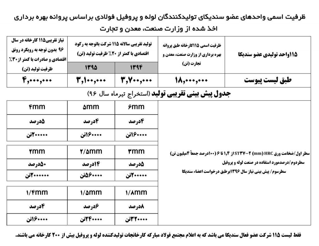 خبرهای روابط عمومی / زنجیره فولاد / گزارش های مرتبط با تامین مواد اولیه ۲۸ تیر ۱۳۹۶ شناسه خبر : 1698 ظرفیت اسمی واحد های عضو سندیکا + پیش بینی تقریبی تولید (تیرماه۱۳۹۶)