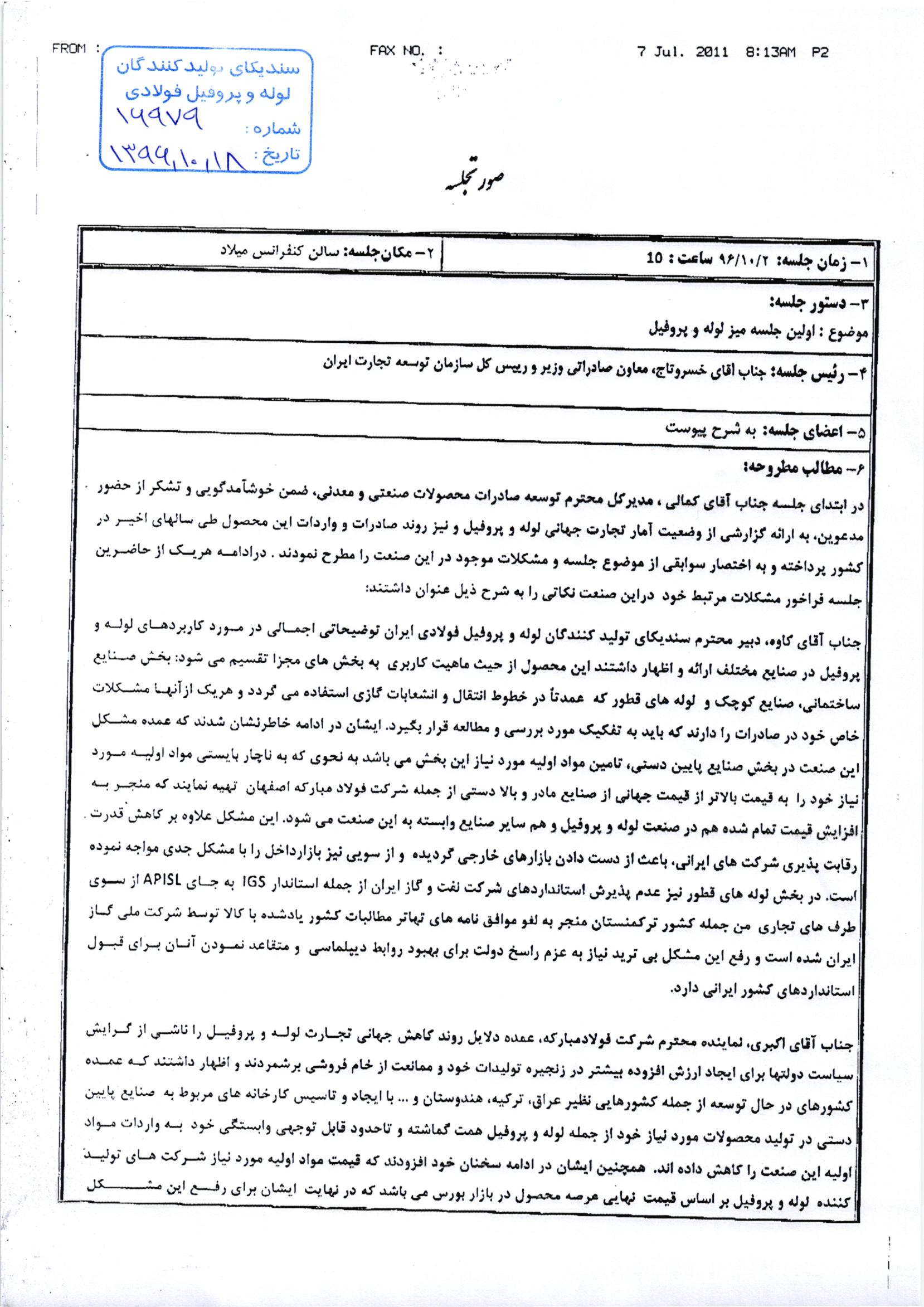 اعضاء جلسه : ریاست و دبیر سندیکای تولیدکنندگان لوله و پروفیل فولادی، معاونت فروش و بازاریابی شرکت فولاد مبارکه، جناب آقای مودودی معاون محترم توسعه صادرات خدمات و کالا کارشناسان صادرات شرکتهای تولیدکننده لوله و پروفیل فولادی، کارشناسان صادرات سازمان توسعه تجارت ایران.