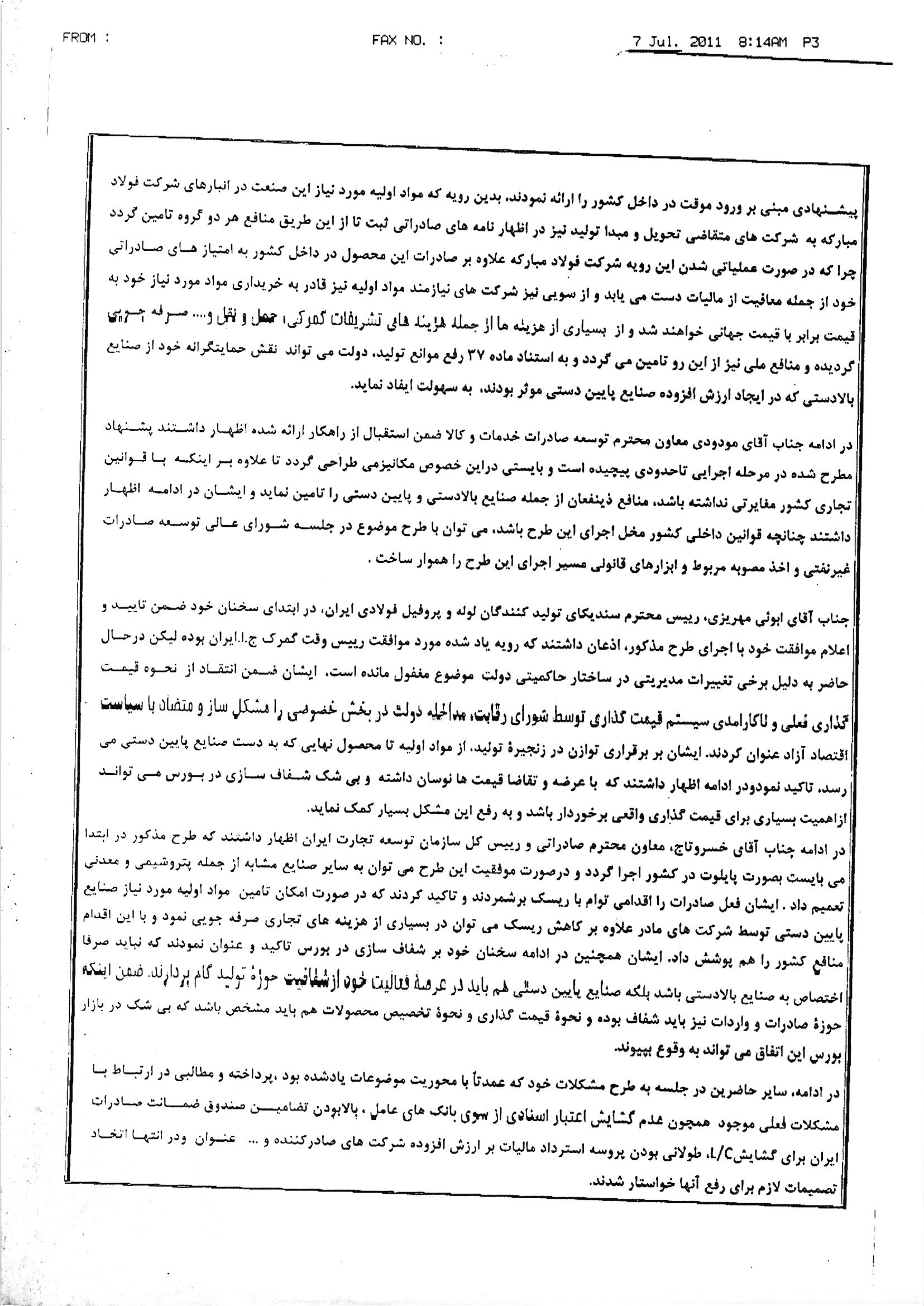 همچنین ایشان در ادامه سخنان خود افزودند که قیمت مواد اولیه موردنیاز شرکت های تولیدکننده لوله و پروفیل براساس قیمت نهایی عرضه محصول در بازار بورس می باشد که در نهایت ایشان برای رفع این مشکل پیشنهادی مبنی بر ورود موقت در داخل کشور را ارائه نمودند، بدین رویه که مواد اولیه موردنیاز این صنعت در انبارهای شرکت فولاد مبارکه به شرکت های متقاضی تحویل و مبدأ تولید نیز در اظهارنامه های صادرات ثبت تا از این طریق منافع هر دو گروه تأمین گردد چرا که در صورت عملیاتی شدن این رویه شرکت فولاد مبارکه علاوه بر صادرات این محصول در داخل کشور به امتیازهای صادراتی خود از جمله معافیت از مالیات دست می یابد و از سویی نیز شرکت های نیازمند مواد اولیه نیز قادر به خریداری مواد موردنیاز خود به قیمت برابر با قیمت جهانی خواهند شد و از بسیاری از هزینه ها از جمله هزینه های تشریفات گمرکی، حمل و نقل و… صرفی جویی گردیده و منافع ملی نیز از این رو تأمین می گردد و به استناد ماده ۳۷ رفع موانع تولید، دولت می تواند نقش حمایت گرانه خود از صنایع بالادستی که در ایجاد ارزش افزوده صنایع پایین دستی موثر بودند، به سهولت ایفاد نماید.
