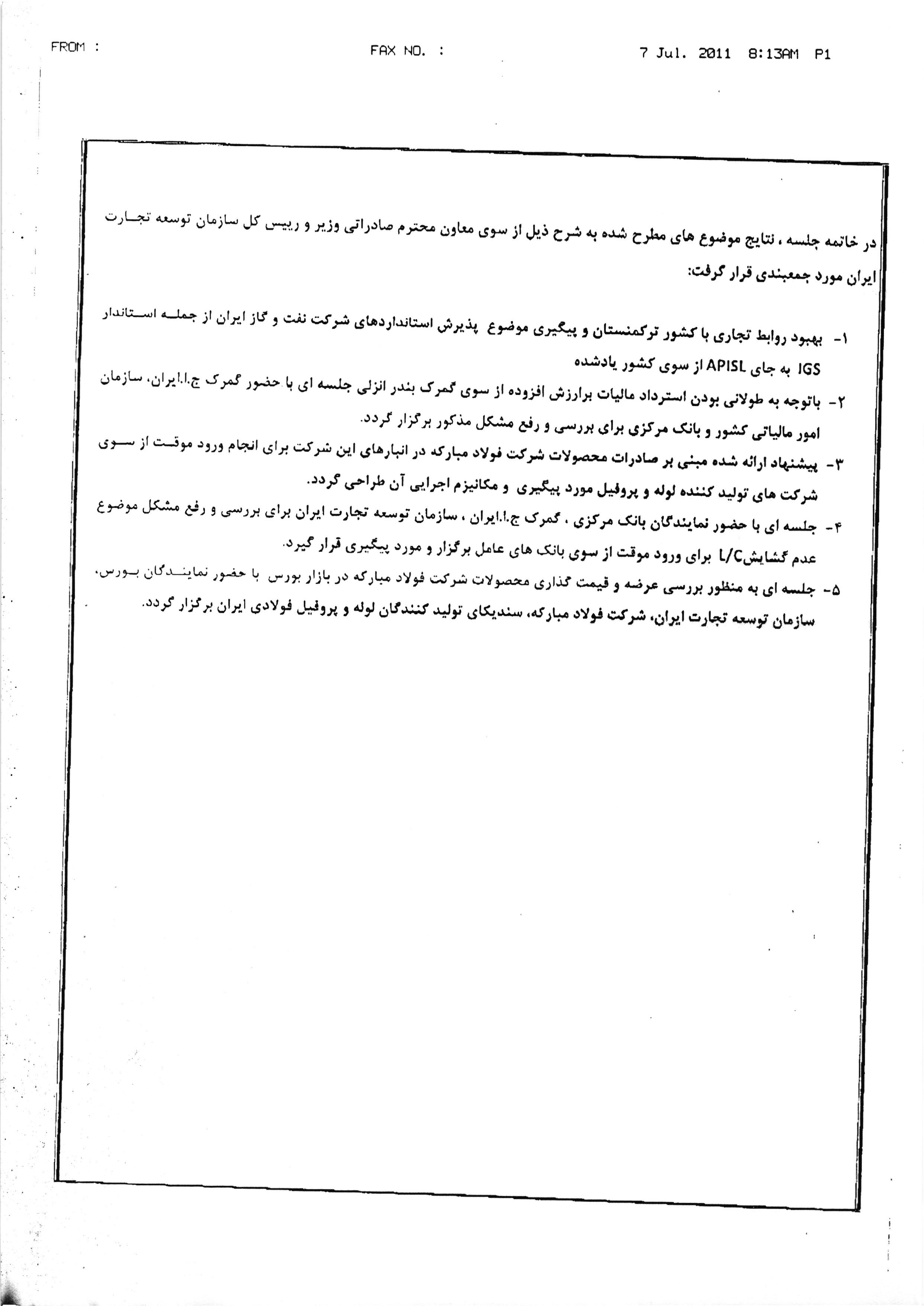 - پیشنهاد ارائه شده مبنی بر صادرات محصولات شرکت فولاد مبارکه در انبارهای این شرکت برای انجام ورود موقت ازسوی شرکتهای تولیدکننده لوله و پروفیل مورد پیگیری و مکانیزم اجرایی آن طراحی گردد.