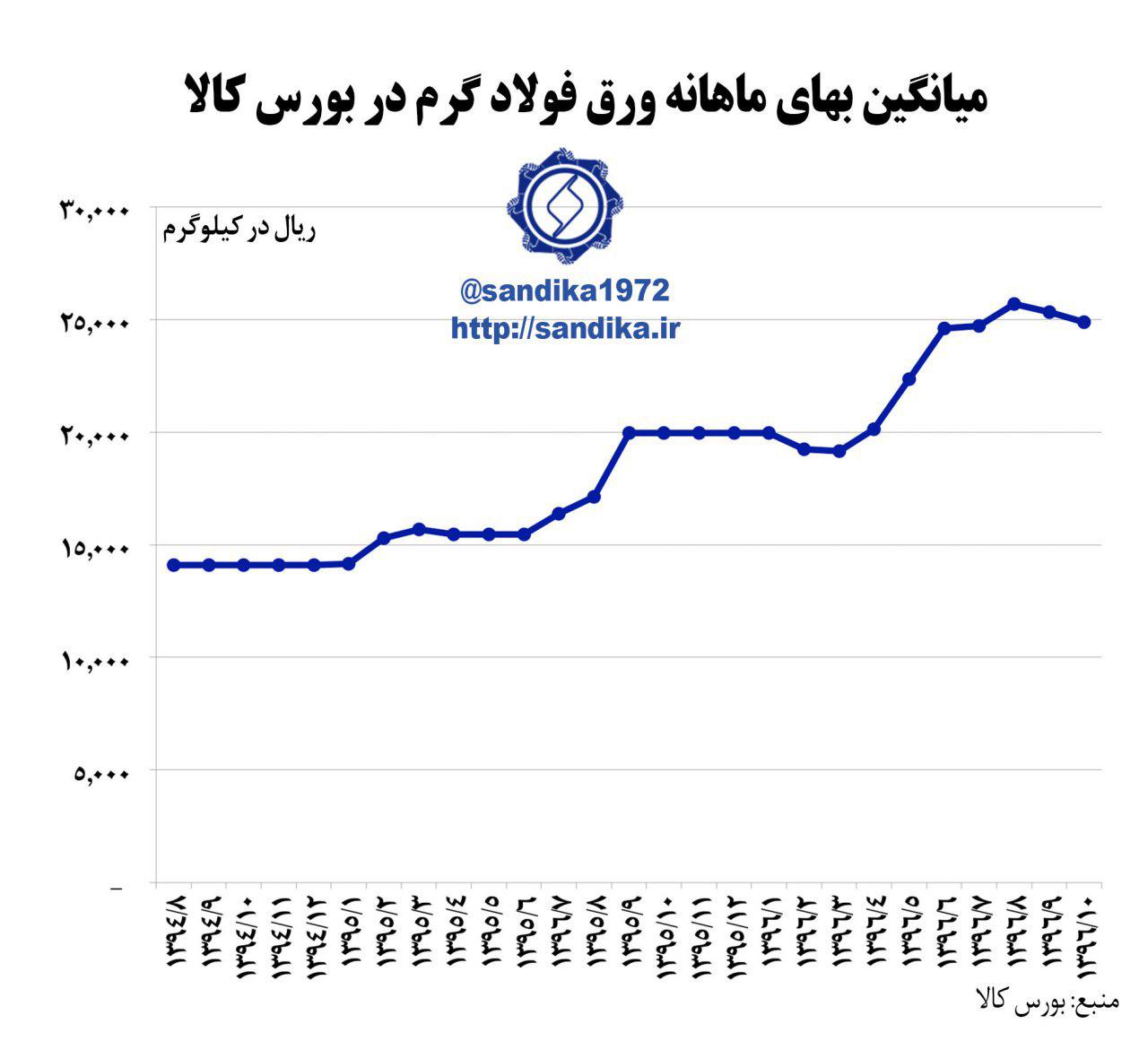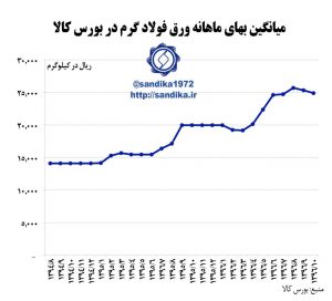سه مرحله افزایش شدید/ میانگین بهای ماهانه ورق گرم فولاد مبارکه در دو سال اخیر بورس کالا /
