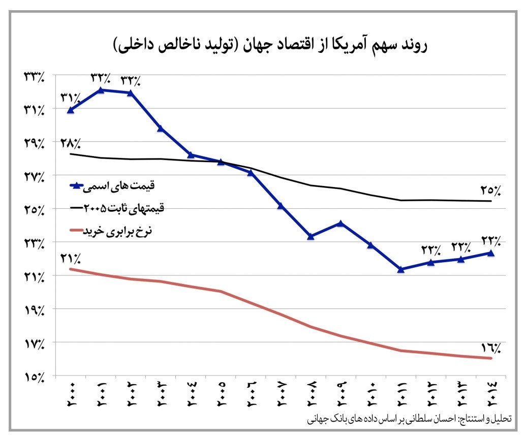 آمریکا تا پانزده سال پیش بزرگترین قدرت اقتصادی جهان با سهم نزدیک به یک-سوم از کل درآمد جهانی (تولید ناخالص داخلی به قیمتهای جاری) محسوب میشد، اما سهم این کشور از اقتصاد جهانی به تدریج کاهش یافت، به صورتی که به ۲۲ درصد از کل جهان تنزل یافته است. درآمد اقتصادی این کشور بر پایه برآوردهای ارزش اسمی و برابری قدرت خرید نیز از روند مشابهی پیروی کرده است. نظر به هزینههای بسیار سنگین لشکرکشیهای گسترده این کشور به عراق و افغانستان که عواقب وخیمی برای جهان و اقتصاد آمریکا بر جای گذشت، سیاست حضور نظامی محدود این کشور در کانونهای نزاع جهانی و به تبع آن تا حدی کاهش اقتدار سیاسی، نارضایتی جناحهای رادیکال سلطهجو و جنگطلب را به همراه داشته است.