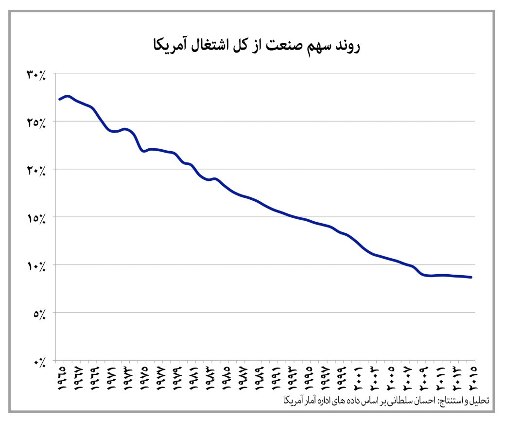 نظر به مزیت رقابتی نیروی کار ارزانقیمت، بخش مهمی از اشتغال کشورهای توسعهیافته به کشورهای در حال توسعه و به تازگی توسعه یافته منتقل شده که آمریکا هم از این امر مستثنی نیست. هم اکنون میزان اشتغال صنعتی آمریکا به کمترین میزان در طی هفت دهه اخیر رسیده و بر پایه دادههای اداره آمار آمریکا از ۱۷ میلیون نفر در سال ۲۰۰۰ میلادی به ۱۲ میلیون نفر در سال جاری تنزل کرده است. با توجه به تاثیر بخش صنعت بر روی کل اقتصاد از جمله ایجاد دو شغل جانبی و القایی به ازای هر شغل تولیدی و همچنین برگشت بالای منابع مالی تزریق شده به صنعت با اثر ۱.۴ برابری، انقباض بخش صنعتی اثرات شدیدتری بر روی دیگر بخشهای اقتصادی به همراه دارد. در نیم قرن پیش سهم بخش صنعت-ساخت از کل اشتغال آمریکا ۲۸ درصد بود که با روند نزولی کم و بیش ثابتی به کمتر از ۹ درصد رسیده است. از سوی دیگر ورود گسترده مهاجرین خارجی که با دستمزدها و شرایط پایینتری حاضر به استخدام هستند، بر روی بازار کار آمریکا فشار میآورد. دو موضوع مهم انتقال مشاغل مولد به خارج از مرزها و و ورود نیروی کار مهاجر ارزانقیمت، شرایط کار و دستمزدهای دریافتی برای نیروی کار بومی آمریکا را به شدت دشوار کرده است که به تبع آن نارضایتیهای زیادی را در بین تولیدکنندگان، کارگران و اقشار فرودست ایجاد میکند. همچنین در شرایطی که نیروهای مولد صنعتی در آمریکا تضعیف شدند، بخشهای بازرگانی، واسطهگری، سوداگری مالی تقویت شدند. ذکر این موضوع لازم میباشد که بخش قابل توجهی از کاهش نیروی کار صنعتی آمریکا بنا به دلایلی از قبیل بکارگیری فنآوریهای جدید، اتوماسیون خطوط تولید و افزایش بهرهوری، رخ داده است.