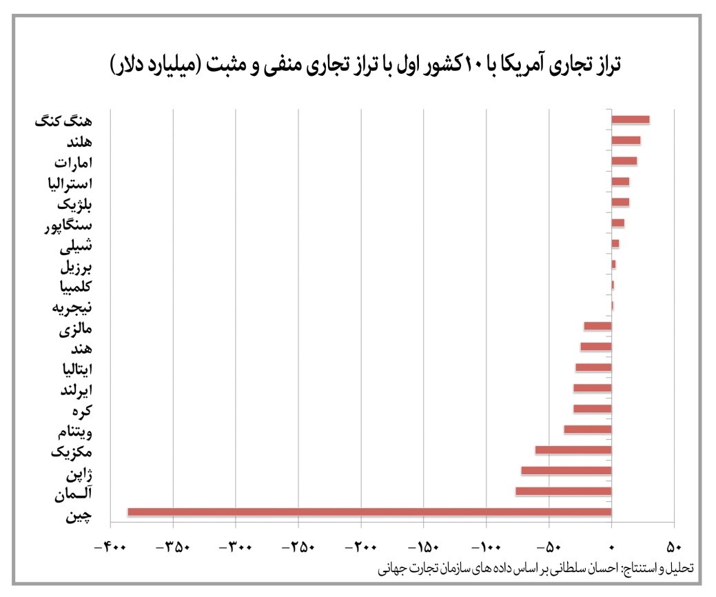 چین با میزان صادرات ۵۰۰ میلیون دلار به آمریکا در سال ۲۰۱۵ میلادی، ۲۲ درصد از ارزش واردات این کشور را به خود اختصاص داد، در حالی که در دو دهه قبل، واردات آمریکا از چین کمتر از ۵۰ میلیارد دلار با سهم ۶ درصد بود. در سال ۲۰۱۵ تبادلات تجاری آمریکا و چین با ۳۹۰ میلیارد دلار تراز تجاری مثبت به نفع چین روبرو گردید و به عبارتی در حدود نیمی از نقصان تراز تجاری آمریکا مربوط به تجارت با چین میباشد. کشورهای بعدی با تراز مثبت تجاری با آمریکا، به ترتیب آلمان، ژاپن و مکزیک با مجموع ۲۰۰ میلیارد هستند. سهم ۷.۶ درصدی مکزیک از کسری موازنه تجاری آمریکا به مراتب از سهم ۴۸ درصدی چین کمتر است. تعداد کشورها با تراز تجاری مثبت چندان زیاد نیست و موارد مهم عمدتاً مربوط به کشورهای هنگکنگ، هلند، امارات متحده عربی، بلژیک و سنگاپور میشود که البته بخش اعظم آن مجدداً صادرات میگردد.