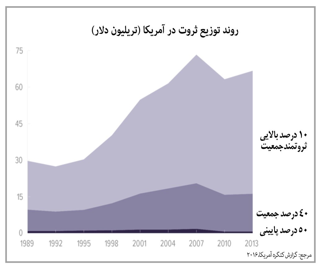 بر طبق تحقیقات اخیر کنگره آمریکا ثروت خانوارهای آمریکایی بالغ بر ۶۷ تریلیون دلار در سال ۲۰۱۳ میلادی گردید. از این ثروت سهم «۱۰ درصد بالای درآمدی (ثروتمند) جمعیت: ۷۶ درصد»، «۵۱ تا ۹۰ درصد بعدی: ۲۳ درصد» و «۵۰ درصد پایین درآمدی (فقیرترین): فقط ۱ درصد» است. متوسط ثروت خانوارهای ۱۰ درصد بالایی: ۴ میلیون دلار، ۵۱ تا ۹۰ درصد بعدی: ۳۱۶ هزار دلار، ۲۶ تا ۵۰ درصد بعدی: ۳۶ هزار دلار میباشد و خانوارهای ۲۵ درصد پایین درآمدی (فقیر) جمعیت به صورت متوسط دارای ۱۳ هزار دلار بدهی هستند. نابرابری ثروت در آمربکا ابعاد و جوانب گستردهای دارد که در یکی دو دهه اخیر تشدید شده است. متوسط ثروت خانوارهای با سرپرست خانوار با تحصیلات دانشگاهی، ۴ برابر خانوارهای با سرپرست خانوار با تحصیلات دبیرستانی میباشد. در طی دوره ۲۰۱۳-۱۹۸۹ ثروت خانوارهای آمریکایی به صورت نامتناسبی افزایش یافته است. در شرایطی که به ثروت ۱۰ درصد بالای درآمدی (ثروتمند) جمعیت، ۵۶ درصد افزوده شده، ۶ درصد از ثروت ۲۵ درصد پایین درآمدی (فقیرترین) کاسته شده است. طبقه متوسط این کشور به شدت تضعیف گردیده، به صورتی که سهم طبقه متوسط آمریکایی از کل ثروت کشور به کمتر از ۲۰ درصد رسیده است و در همین حال سهم طبقه متوسط از کل ثروت ملی کشورهای کانادا، فرانسه، انگلستان و ژاپن به ترتیب ۳۹، ۳۹، ۴۰ و ۴۹ درصد است. این موضوع با دارایی متوسط کمتر کل مردم آمریکا نسبت به اغلب کشورهای توسعهیافته توام میباشد.