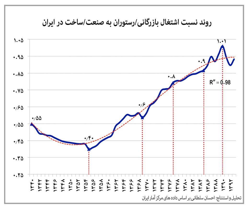 متاسفانه پس از پایان دوران دفاع مقدس، به نحو مستمر در ۲۷ سال اخیر و به خصوص از ابتدای دهه هشتاد با رشد بخشهای نامولد اقتصادی، میزان مشاغل زائد در بخشهای تجاری، سفتهبازی، دلالی، وارداتی (شامل قاچاق) رشد کرده است. در حالی که در چهار دهه پیش به ازای هر ۲.۵ نفر شاغل در بخش مولد صنعت-ساخت یک شغل در بخش بازرگانی-رستوران (شامل عمدهفروشی، خردهفروشی، خدمات تعمیرات و رستوران) وجود داشت، در سال ۱۳۹۰ میزان اشتغال در این فعالیتها از بخش صنعت-ساخت فراتر رفت. روند مشابهی هم برای بخش ساختمان در مقایسه با صنعت-ساخت وجود دارد.