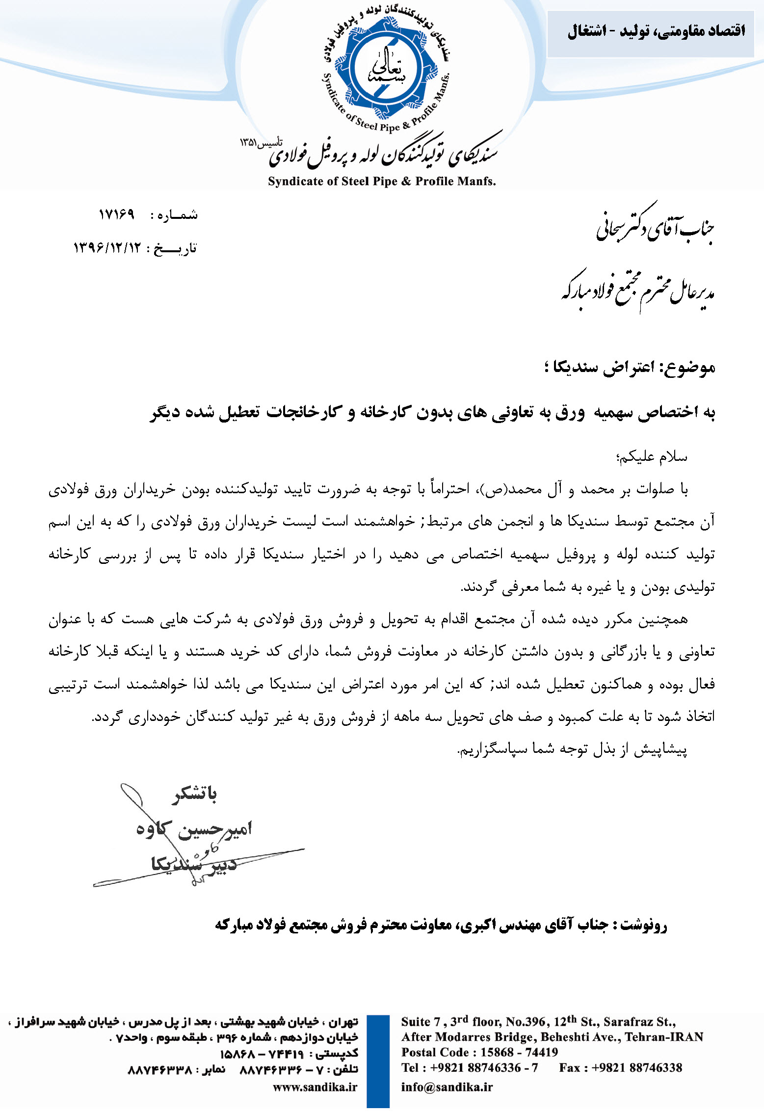 زنجیره فولاد / نامه های مهم ۱۳ اسفند ۱۳۹۶ شناسه خبر : 3965 اعتراض سندیکا به اختصاص سهمیه ورق به تعاونی های بدون کارخانه اعتراض سندیکا ؛ به اختصاص سهمیه ورق به تعاونی های بدون کارخانه و کارخانجات تعطیل شده دیگر . اعتراض سندیکا ؛ به اختصاص سهمیه ورق به تعاونی های بدون کارخانه و کارخانجات تعطیل شده دیگر .