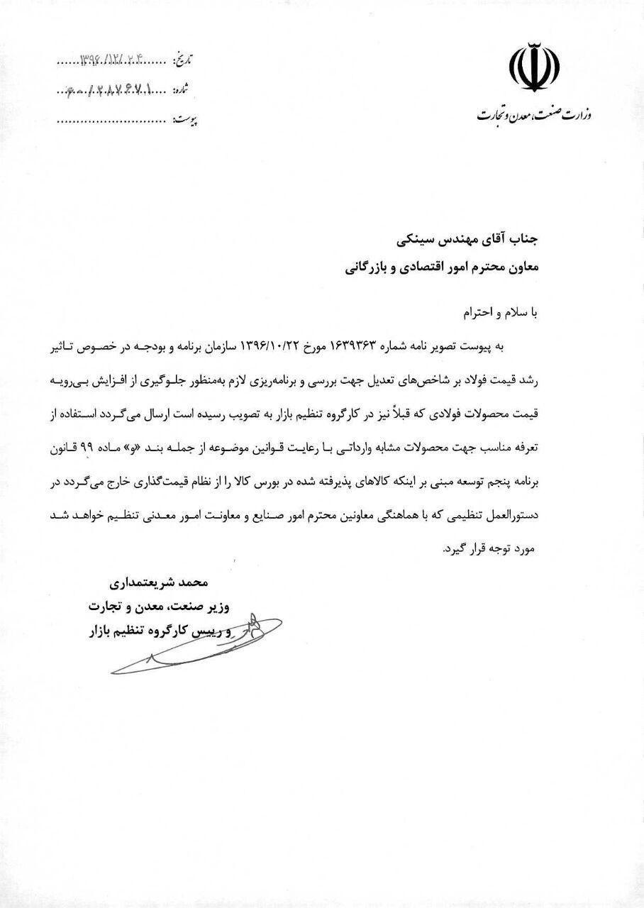 به پیوست تصویر نامه شماره ۱۶۳۹۳۶۳ مورخ ۱۳۹۶/۱۰/۲۲ سازمان برنامه و بودجه در خصوص تأثیر رشد قیمت فولاد بر شاخصهای تعدیل جهت بررسی و برنامه ریزی لازم به منظور جلوگیری از افزایش بیرویه قیمت محصولات فولادی که قبلاً نیز در کارگروه تنظیم بازار به تصویب رسیده است ارسال میگردد استفاده از تعرفه مناسب جهت محصولات مشابه وارداتی با رعایت قوانین موضوعه از جمله بند «و» ماده ۹۹ قانون برنامه پنجم توسعه مبنی بر اینکه کالاهای پذیرفته شده در بورس کالا را از نظام قیمتگذاری خارج می گردد در دستورالعمل تنظیمی که با هماهنگی معاونین محترم امور صنایع و معاونت امور معدنی تنظیم خواهد شد مورد توجه قرار گیرد.