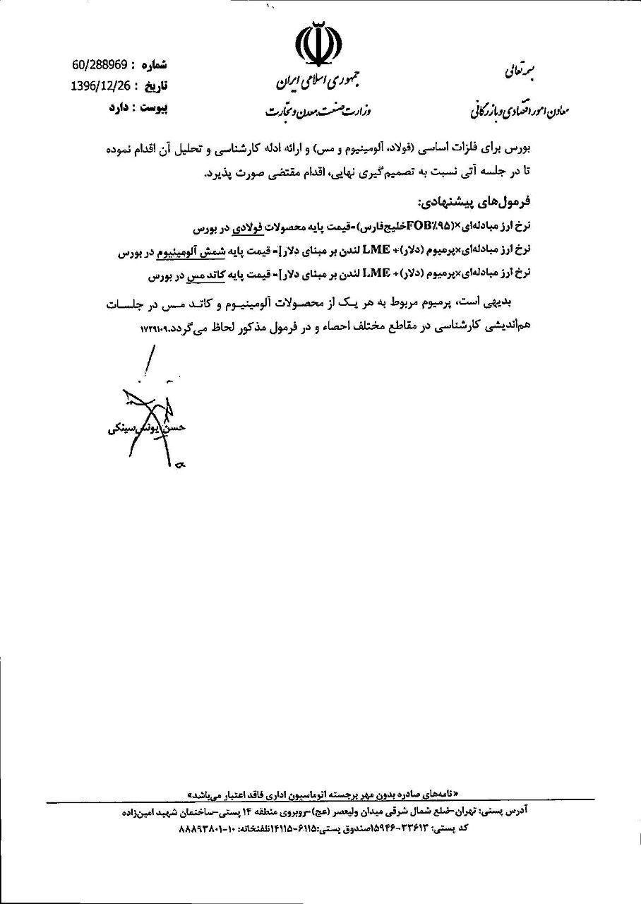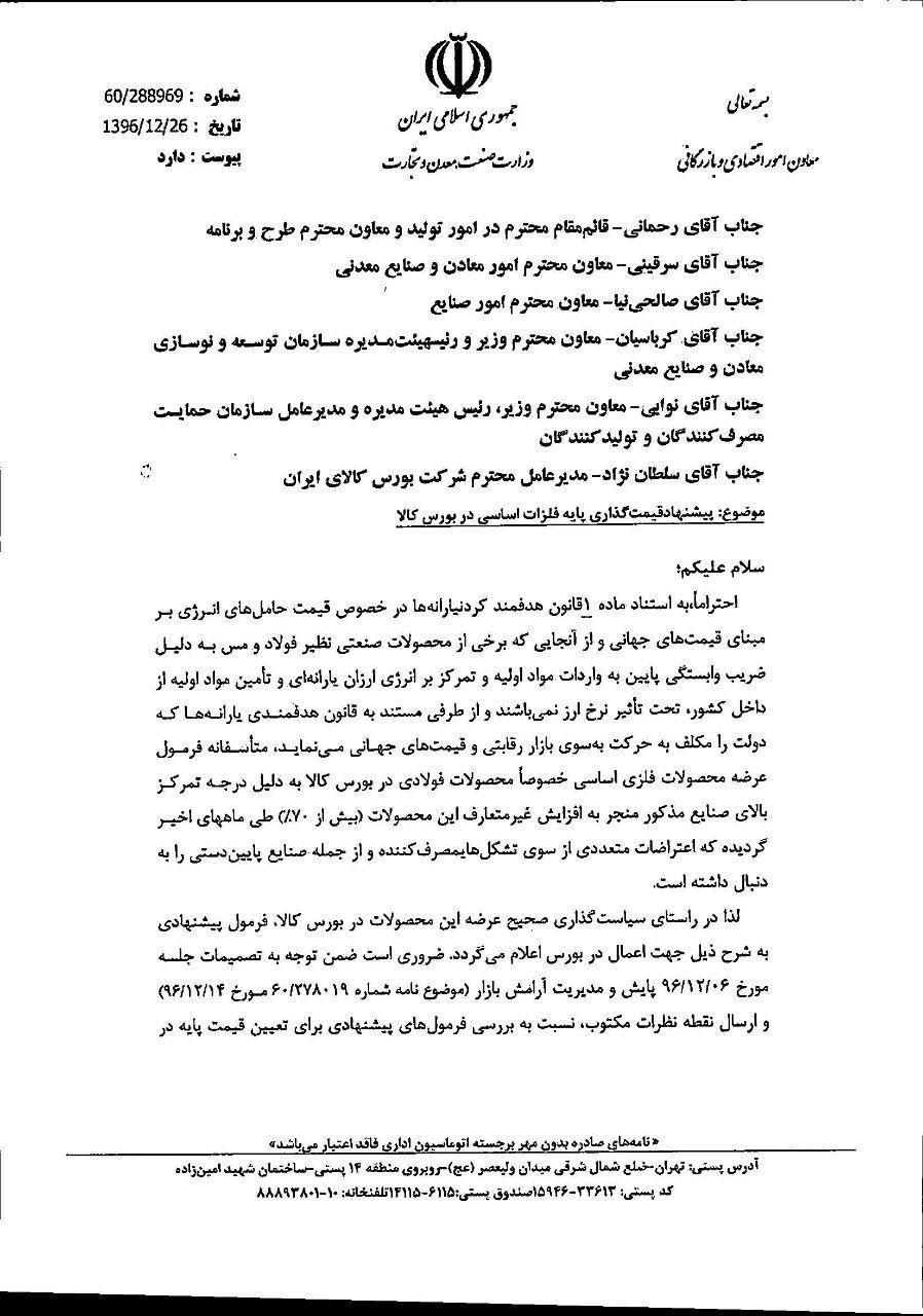 لذا در راستای سیاست گذاری صحیح عرضه این محصولات در بورس کالا، فرمول پیشنهادی به شرح ذیل جهت اعمال در بورس اعلام می گردد. ضروری است ضمن توجه به تصمیمات جلسه مورخ ۱۳۹۶/۱۲/۶ پایش و مدیریت آرامش بازار (موضوع نامه شماره ۲۷۸۰۱۹/۶۰ مورخ ۱۳۹۶/۱۲/۱۴ و ارسال نقطه نظرات مکتوب، نسبت به بررسی فرمول های پیشنهادی برای تعیین قیمت پایه در بورس برای فلزات اساسی (فولاد، آلومینیوم و مس) و ارائه ادله کارشناسی و تحلیل آن اقدام نموده تا در جلسه آتی نسبت به تصمیم گیری نهایی، اقدام مقتضی صورت پذیرد.