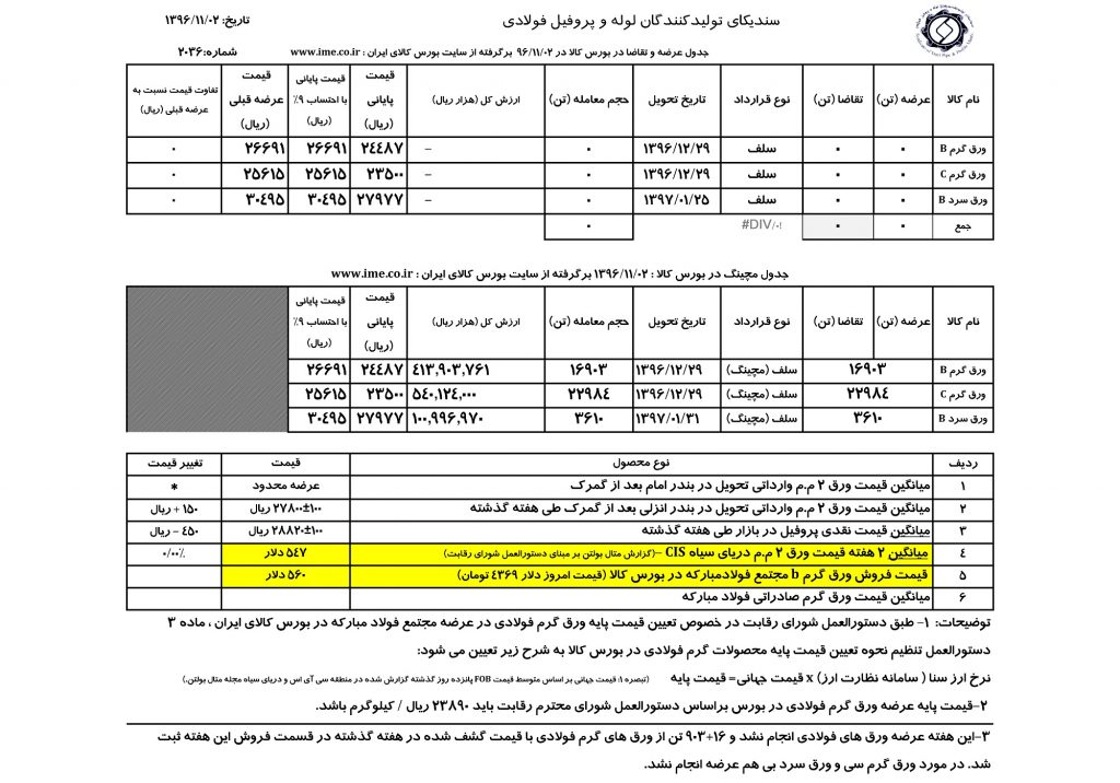 جدول هفتگی قیمت ها ۱۸ فروردین ۱۳۹۷ شناسه خبر : 4078 ۲-۱۱-۹۶ قیمت ورق داخلی و خارجی و قیمت پروفیل و قیمت ورق در بنادر