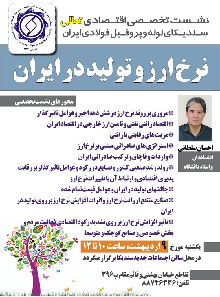 ✅ نرخ ارز و تولید در ایران 🔰 سخنران: احسان سلطانی 🔹 یکشنبه ۹ اردیبهشت، ساعت ۱۰ تا ۱۲ 🔹 خیابان بهشتی نبش قائم مقام، سندیکای تولیدکنندگان لوله و پروفیل فولادی ایران