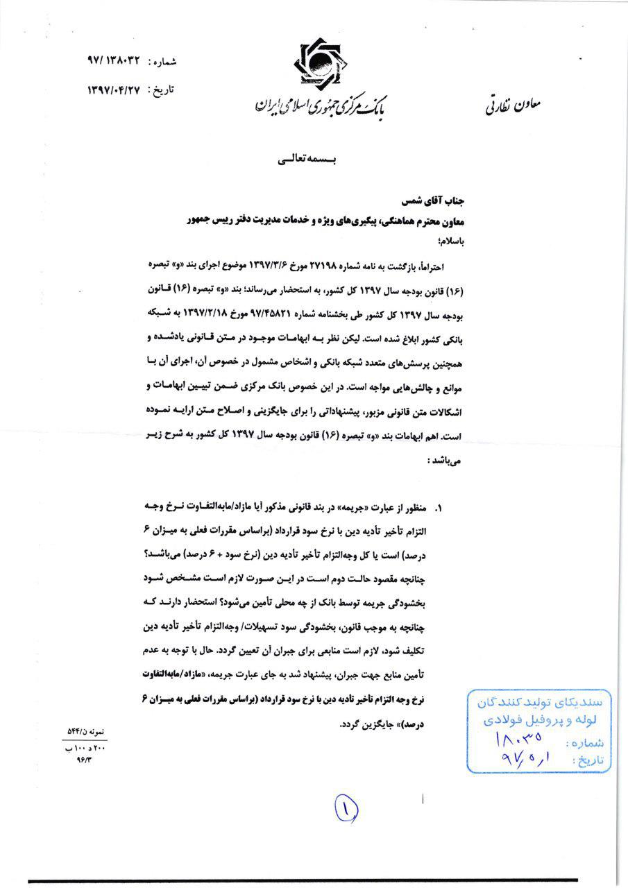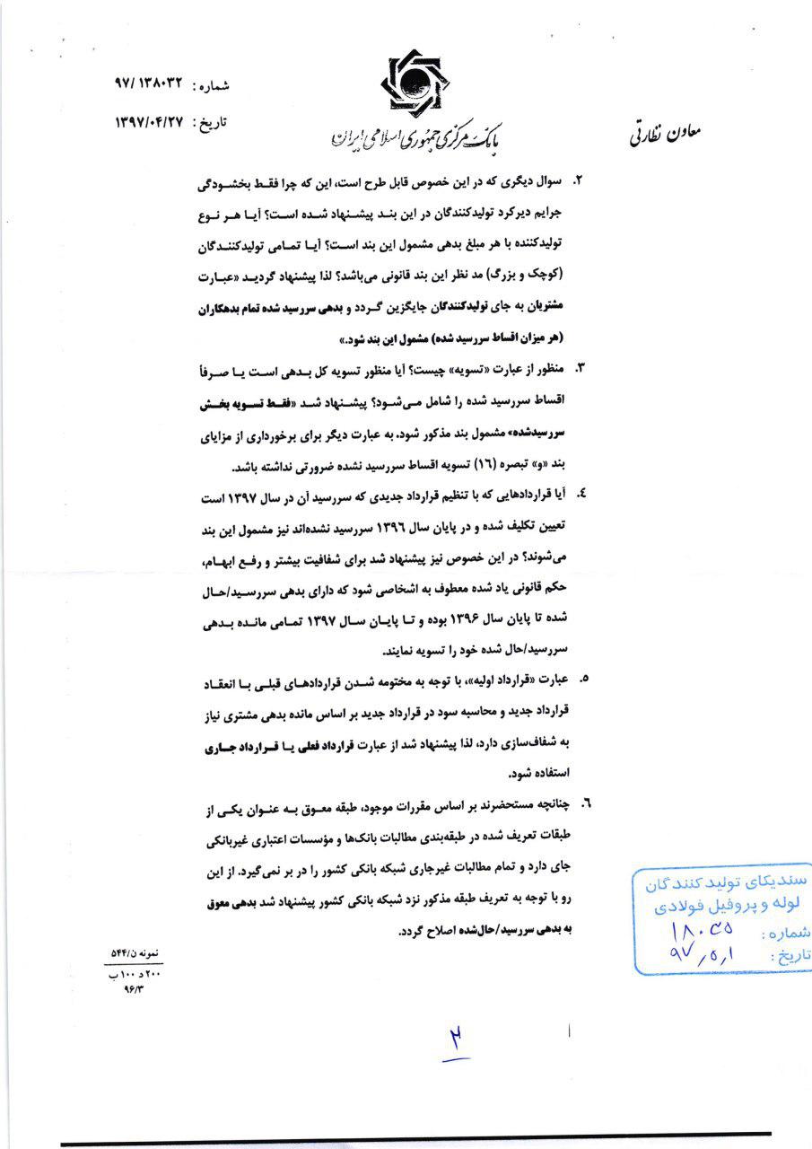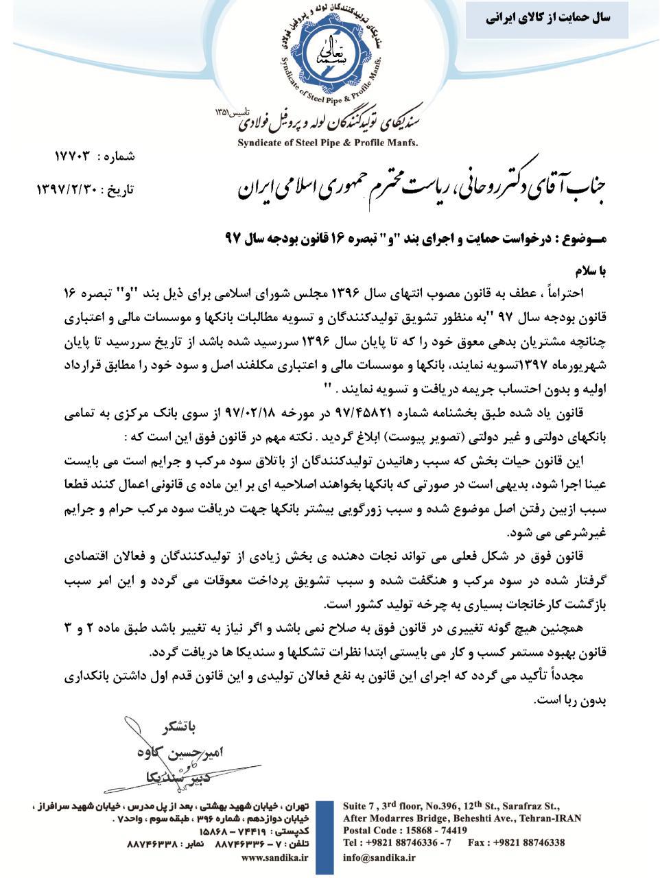 سلام علیکم احتراماً به استحضار می رساند به دنبال مصوبه بند و تبصره ۱۶ به منظور تشویق تولیدکنندگان و تسویه مطالبات بانک مقرر گردیده چنانچه مشتریان بدهی معوق خود را تا پایان سال ۱۳۹۶ سررسید شده باشد از تاریخ سررسید تا پایان شهریورماه ۱۳۹۷ تسویه نمایند بانکها ، موسسات مالی و اعتباری مکلفند اصل و […]