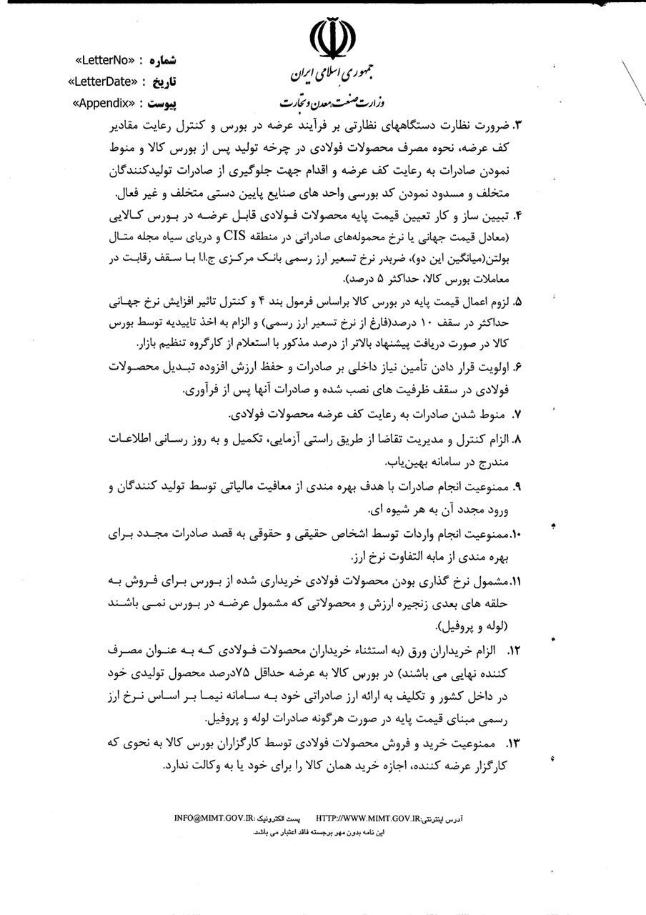 ۴- تبیین ساز و کار تعیین قیمت پایه محصولات فولادی قابل عرضه در بروس کالایی (معادن قیمت جهانی با نرخ محمولههای صادراتی در منطقه CIS و دریای سیاه مجله متال بولتن (میانگین این دو)، ضربدر نرخ تسعیر ارز رسمی بانک مرکزی ج.ا.ا با سقف رقابت در معاملات بورس کالا، حداکثر ۵ درصد).