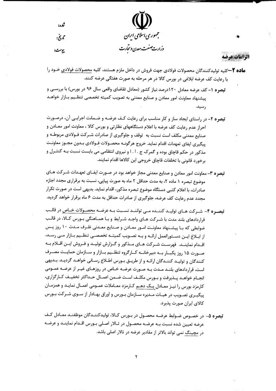 ۲- مقادیر کف عرضه محصولات فولادی مطابق ۱۲۰ درصد نیاز کشور (تقاضای واقعی سال ۱۳۹۶ در بورس) با پیشنهاد معاونت امور معادن و صنایع معدنی و تصویب کمیته تخصصی تنظیم بازار تعیین خواهد گردید.
