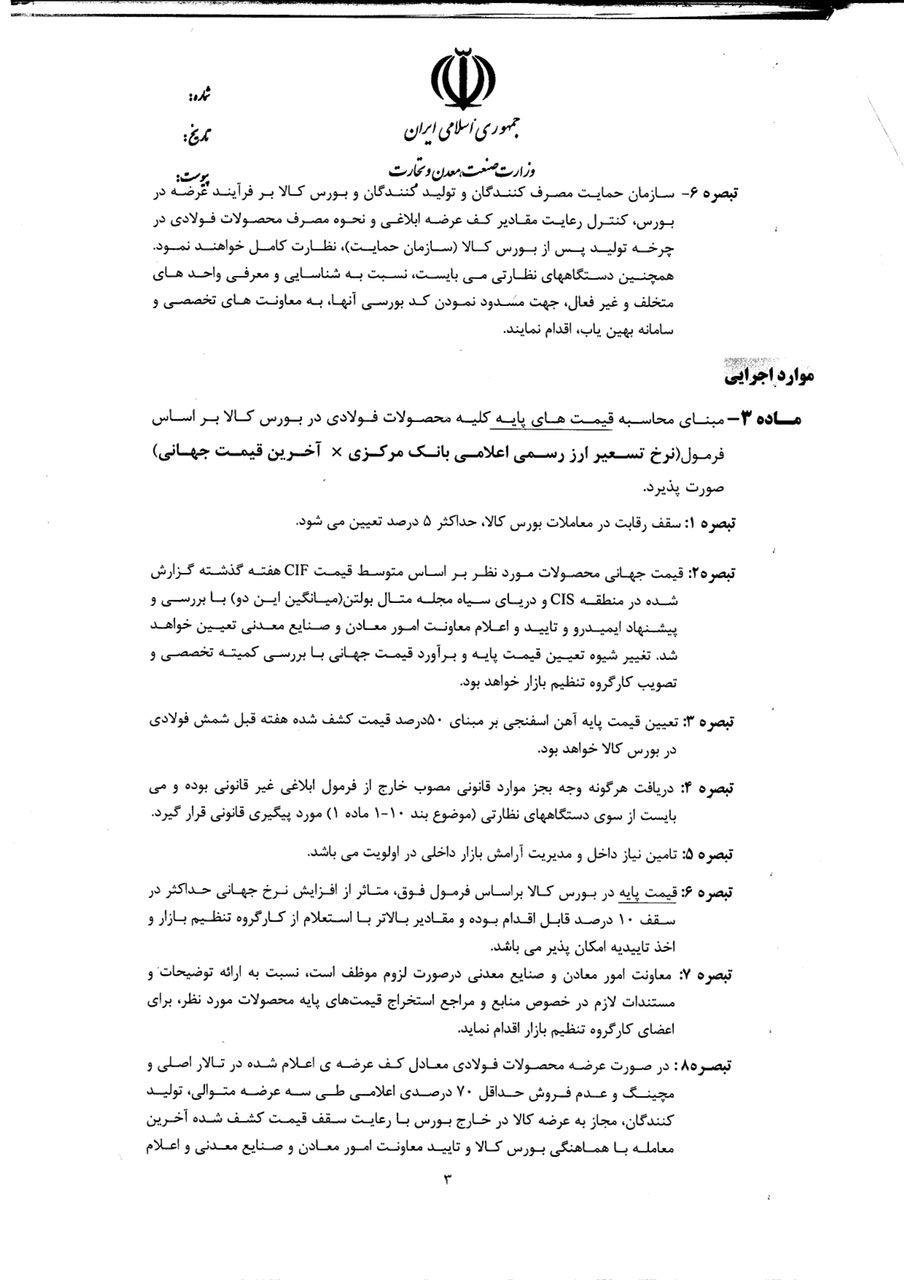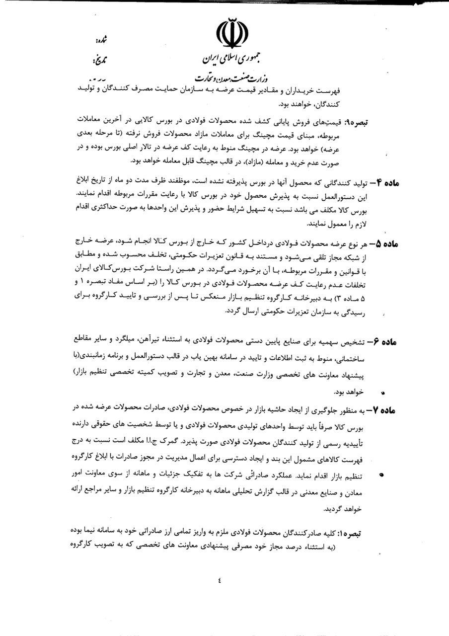 ۵- لزوم اعمال قیمت پایه در بورس کالا براساس فرمول بند ۴ و کنترل تاثیر افزایش نرخ جهانی حداکثر در سقف ۱۰ درصد (فارغ از نرخ تسعیر ارز رسمی) و الزام به اخذ تاییدیه توسط بورس کالا در صورت دریافت پیشنهاد بالاتر از درصد مذکور با استعلام از کارگروه تنظیم بازار.