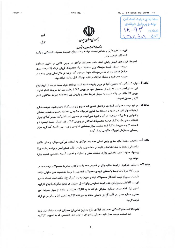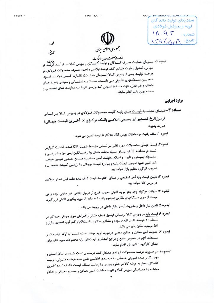 ۴- تبیین ساز و کار تعیین قیمت پایه محصولات فولادی قابل عرضه در بروس کالایی (معادن قیمت جهانی با نرخ محمولههای صادراتی در منطقه CIS و دریای سیاه مجله متال بولتن (میانگین این دو)، ضربدر نرخ تسعیر ارز رسمی بانک مرکزی ج.ا.ا با سقف رقابت در معاملات بورس کالا، حداکثر ۵ درصد).