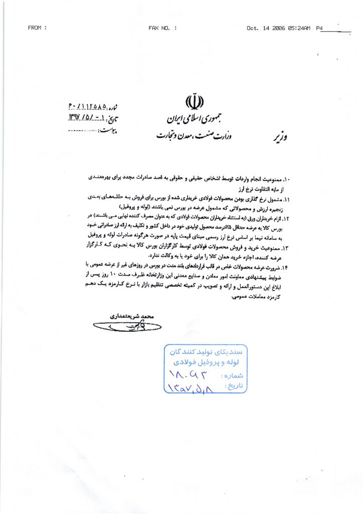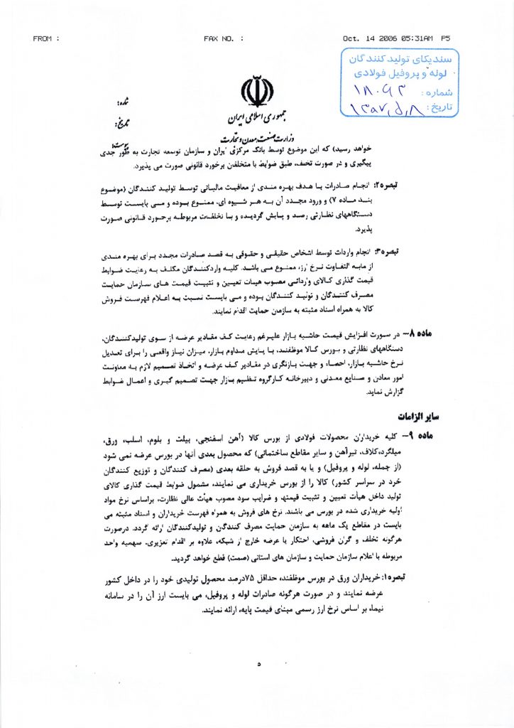 ۱۲- الزام خریداران ورق (به استثناء خریداران محصولات فولادی که به عنوان مصرف کننده نهایی میباشند) در بورس کالا به عرضه حداقل ۷۵ درصد محصول تولیدی خود در داخل کشور و تکلیف به ارائه ارز صادراتی خود به سامانه نیما براساس نرخ ارز رسمی مبنای قیمت پایه در صورت هرگونه صادرات لوله و پروفیل.