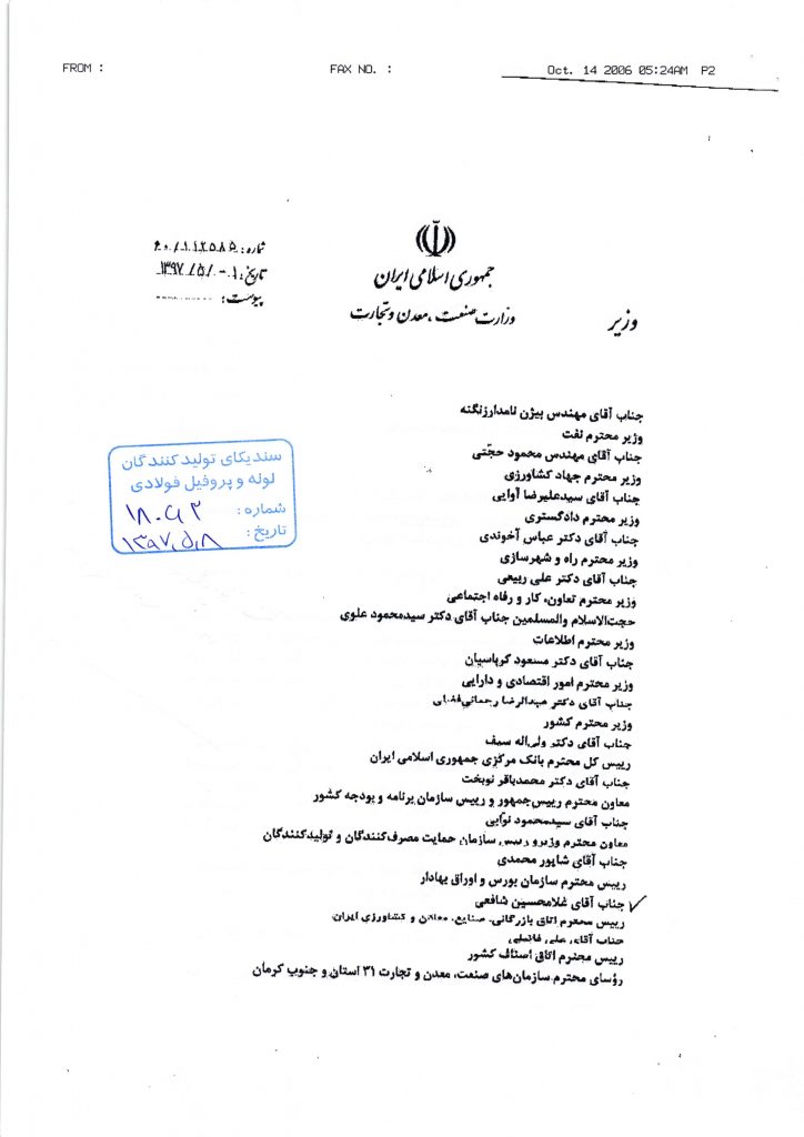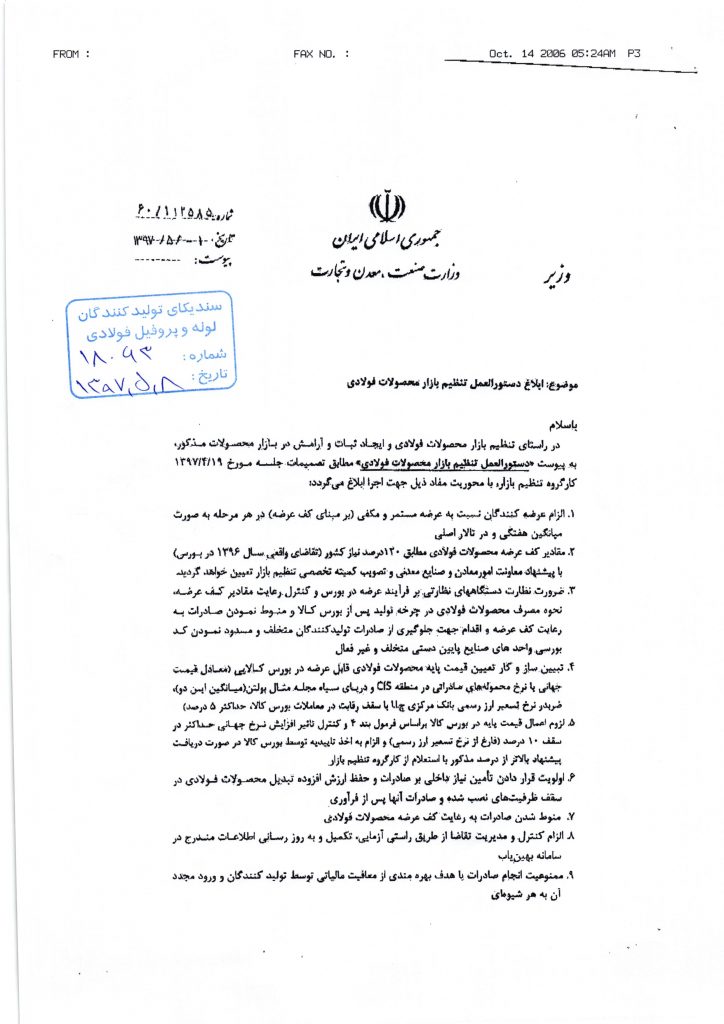 محمد شریعتمداری وزیر صنعت، معدن و تجارت دستور العمل جدید تنظیم بازار محصولات فولادی را ابلاغ کرد که در این ابلاغیه آمده است: در راستای تنظیم بازار محصولات فولادی و ایجاد ثبات و آرامش در بازار محصولات مذکور، به پیوست «دستورالعمل تظنیم بازار محصولات فولادی» مطابق تصمیمات جلسه مورخ ۱۹ تیر ماه ۱۳۹۷ کارگروه تنظیم بازار، با محوریت مفاد ذیل جهت اجرا ابلاغ میگردد: