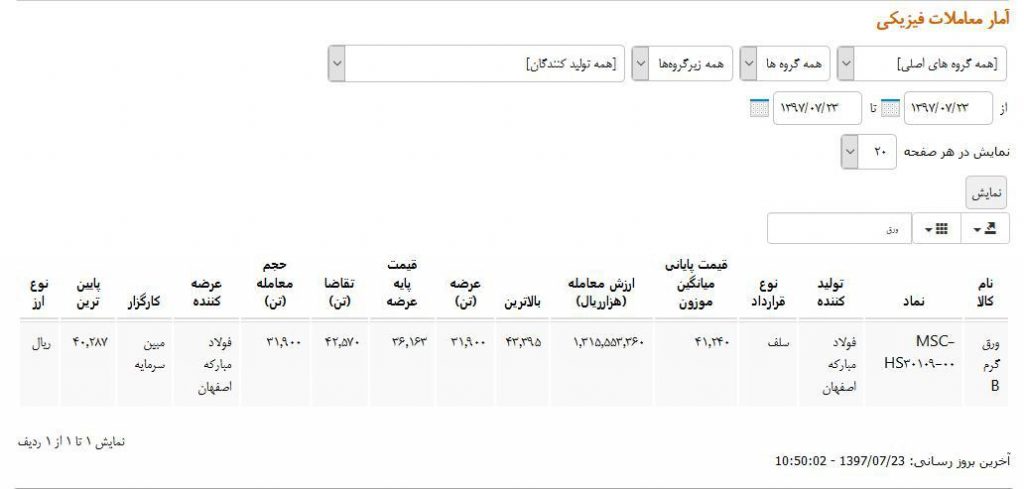 آمار معاملات ورق گرم فولادی مورخ ۲۳-۷-۹۷