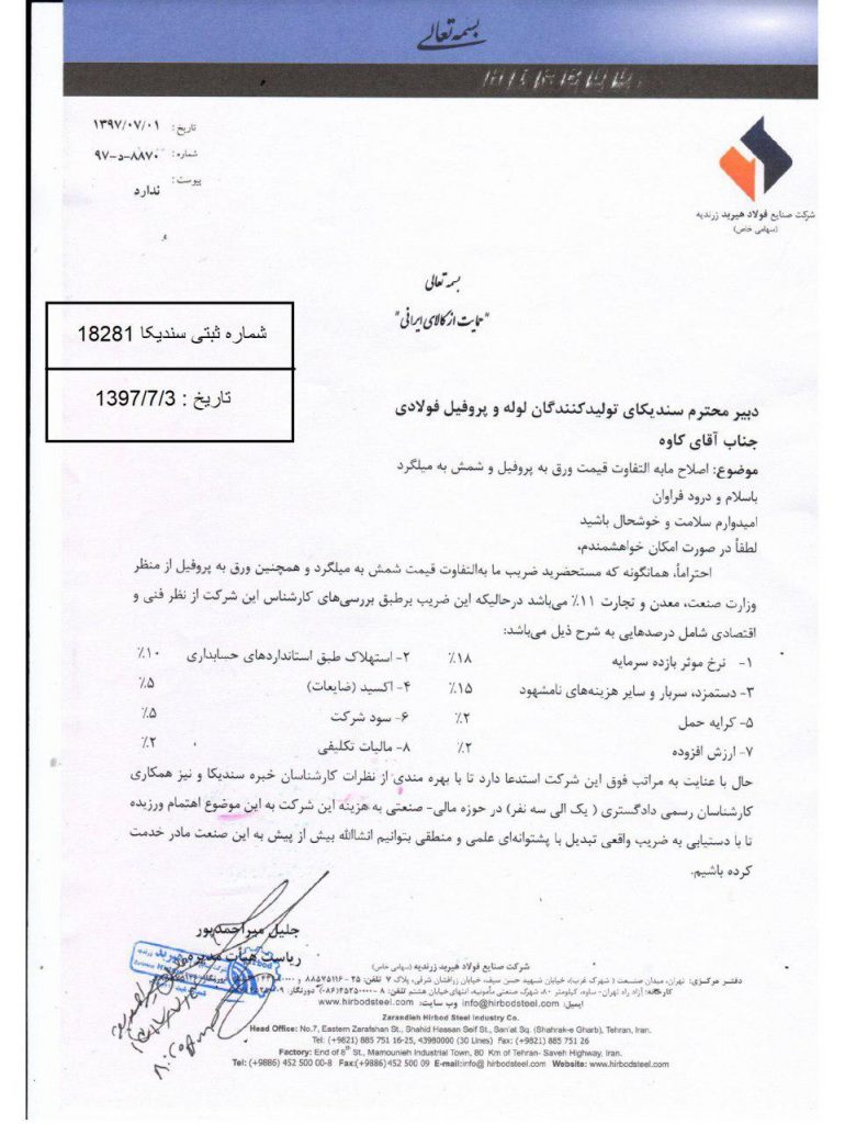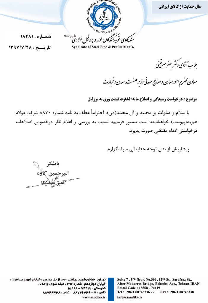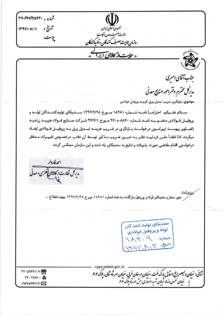 نامه سازمان حمایت در خصوص بازنگری ضریب تبدیل ورق گرم به پروفیل فولادی، پیرو نامه ۱۸۲۸۱ سندیکا به وزارت صنایع