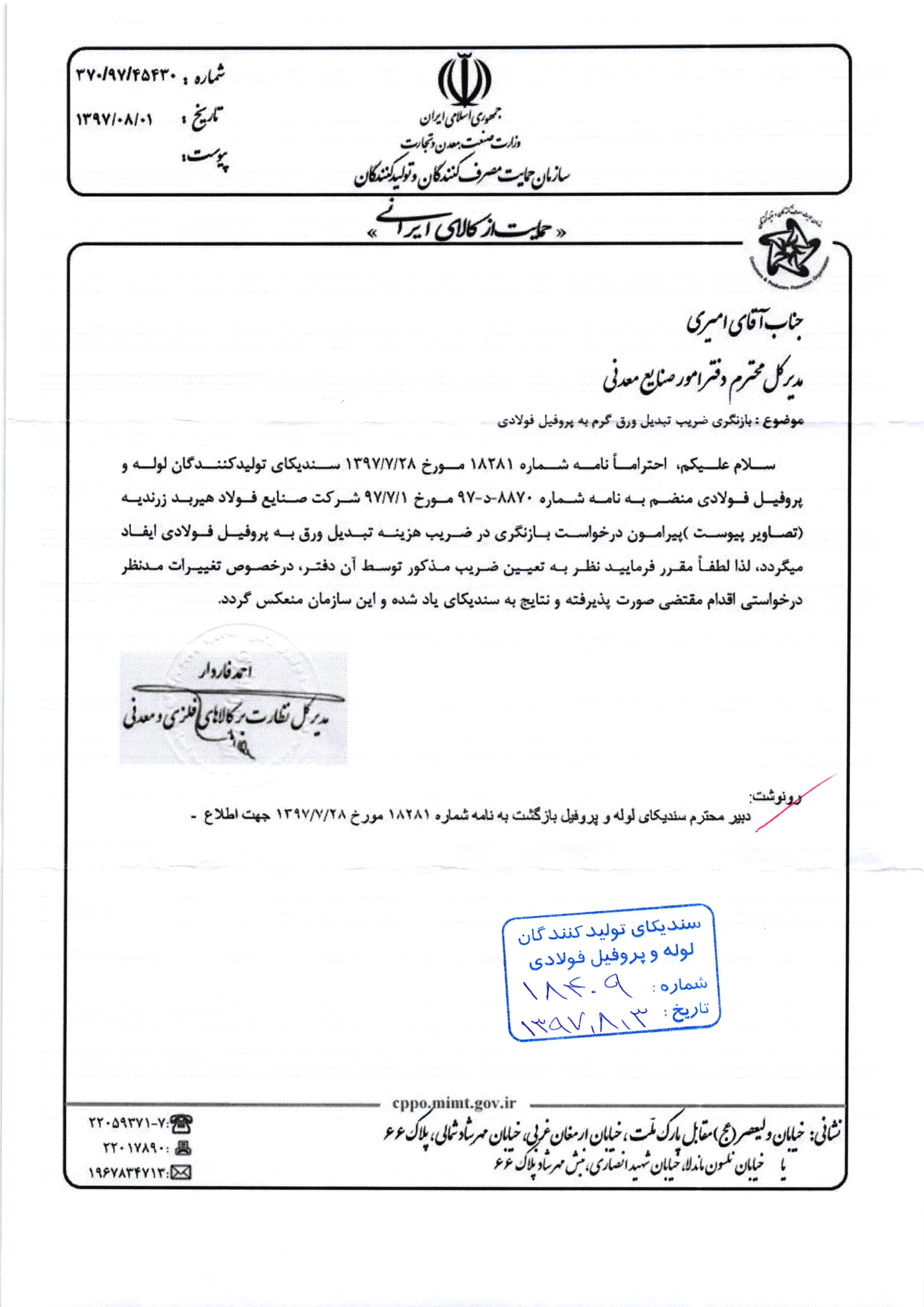 درخواست از سازمان حمایت جهت اصلاح ضریب و درصد کارمزد تولید ورق به پروفیل