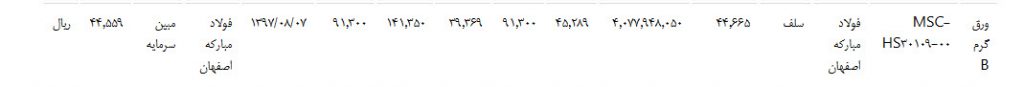 آمار معاملات محصولات فولاد مبارکه ۹۷/۰۸/۰۷