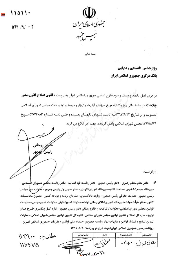 پیشخوان / تاپ / گوناگون ۰۵ آذر ۱۳۹۷ شناسه خبر : 5023 قانون اصلاح قانون صدور چک توسط ریاستجمهوری ابلاغ شد متن کامل در لینک زیر ghanoon eslah chek http://sandika.ir/wp-content/uploads/ghanoon-eslah-chek.pdf متن کامل در لینک زیر ghanoon eslah chek http://sandika.ir/wp-content/uploads/ghanoon-eslah-chek.pdf