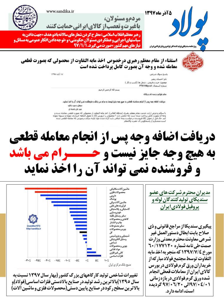 پیگیری سندیکا از مراجع قانونی و ذی صلاح بابت ابطال دستورالعمل غیر شرعی معاونت محترم معدنی وزارت صمت طی نامه شماره ۱۷۷۱۲۰/۶۰ مورخ ۴/۷/۱۳۹۷ که منجر به اخذ مابه التفاوت توسط مجتمع فولاد مبارکه از خریداران ورق گرم فولادی در بورس کالای ایران از معاملات قعطی انجام شده ورق گرم فولادی در بازه زمانی ۰۱/۰۴/۹۷ الی ۲۰/۰۶/۹۷ گردیده است، ادامه دارد.