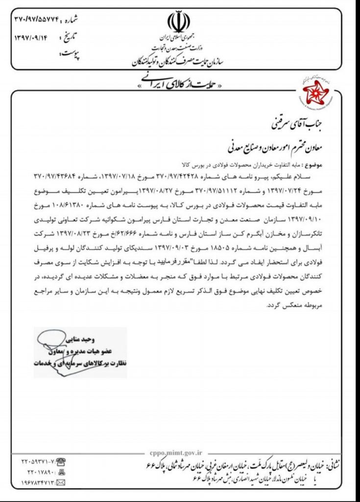سلام علیکم، پیرو نامه های شماره ۳۷۰/ ۹۷ / ۴۲۴۲۸ مورخ ۱۳۹۷/ ۰۷ / ۱۸ ، شماره ۳۷۰/ ۹۷ /۴۳۶۸۴ مورخ ۱۳۹۷/ ۰۷ / ۲۴ و شماره ۳۷۰/ ۹۷ / ۵۱۱۱۲ مورخ ۱۳۹۷/ ۸ / ۲۷ پیرامون تعیین تکلیف موضوع مابه التفاوت قیمت محصولات فولادی در بورس کالا، به پیوست نامه های شماره ۱۰۸۶۱۳۸۰ مورخ ۱۳۹۷ / ۰۹ / ۱۰ سازمان صنعت معدن و تجارت استان فارس پیرامون شکوائیه شرکت تعاونی تولیدی تانکرسازان و مخازن آبگرم کن ساز استان فارس و نامه شماره ۶۲ / ۶۶۶ خ مورخ ۱۳۹۷ / ۰۸ /۲۳ شرکت آبسال و همچنین نامه شماره ۱۸۵۰۵ مورخ ۱۳۹۷/ ۰۹ / ۰۳ سندیکای تولیدکنندگان لوله و پرفیل فولادی برای استحضار ایفاد می گردد. لذا لطفا” مقرر فرمایید با توجه به افزایش شکایت از سوی مصرف کنندگان محصولات فولادی مرتبط با موارد فوق که منجر به معضلات و مشکلات عدیده ای گردیده، در خصوص تعیین تکلیف نهایی موضوع فوق الذکر تسریع لازم معمول و نتیجه به این سازمان و سایر مراجع مربوطه منعکس گردد.