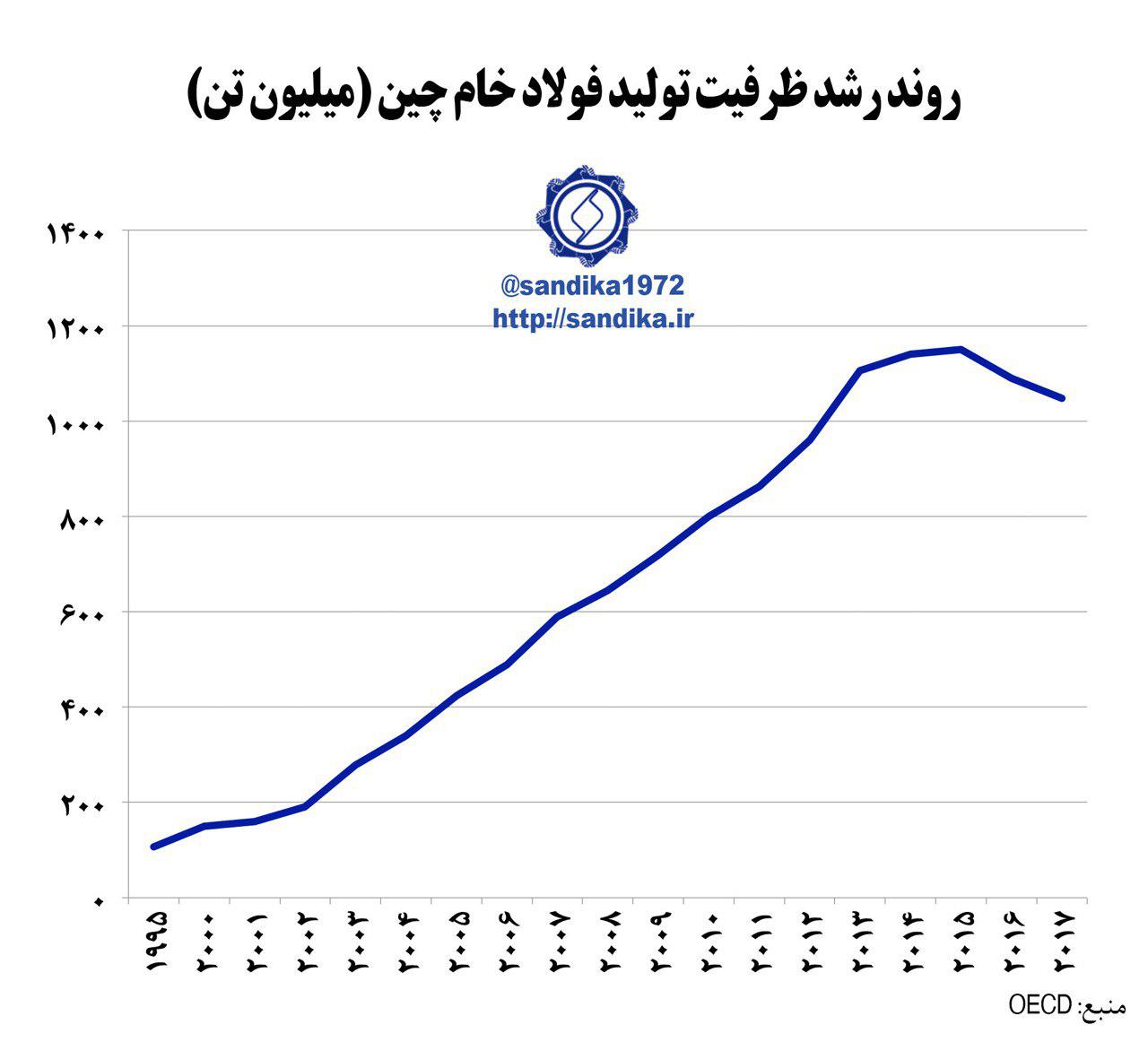 نمودار ۱۱۷ ✅ ظرفیت تولید فولاد خام چین از ۱۵۰ میلیون تن در سال ۲۰۰۰ میلادی به ۱۱۰۰ میلیون تن در سال ۲۰۱۳ امیلادی صعود کرد، اما در دو سال اخیر کاهش یافت.