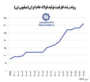 نمودار ۱۱۱✅در طی سالهای ۲۰۰۷ تا ۲۰۱۷ میلادی ظرفیت تولید فولاد خام ایران از ۱۲ به ۳۱ میلیون تن افزایش یافت.