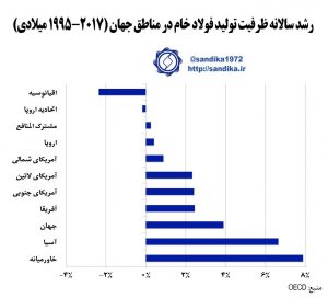 نمودار ۱۱۰🔆در دوره ۲۰۱۷-۱۹۹۵ ظرفیت تولید فولاد خام در منطقه خاورمیانه سالانه ۸ درصد افزایش یافت که دو برابر رشد جهانی است