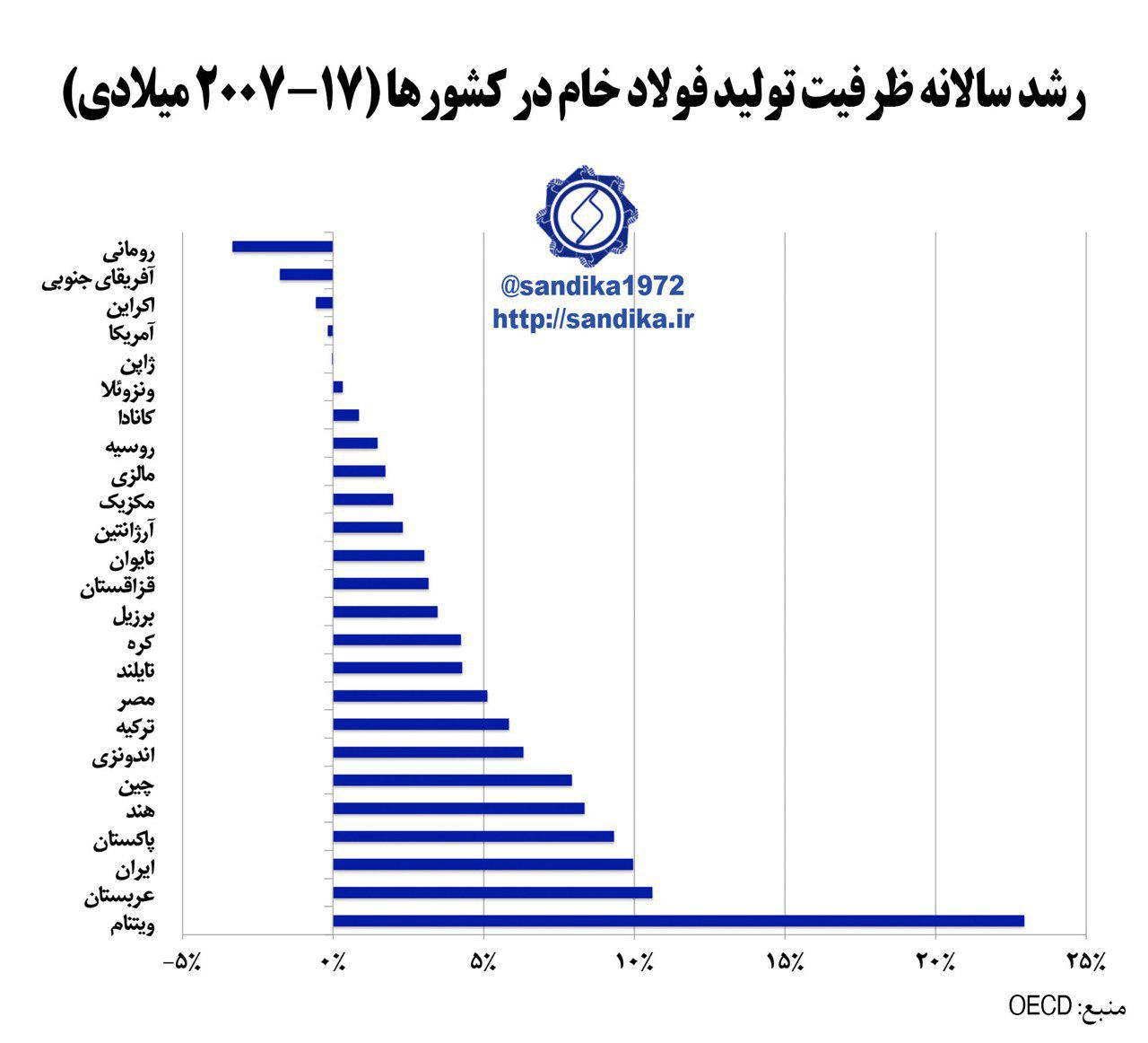 نمودار ۱۰۷ ✅ویتنام، عربستان سعودی و ایران دارای بالاترین رشد ظرفیت تولید فولاد خام در دوره ۱۷-۲۰۰۷ میلادی