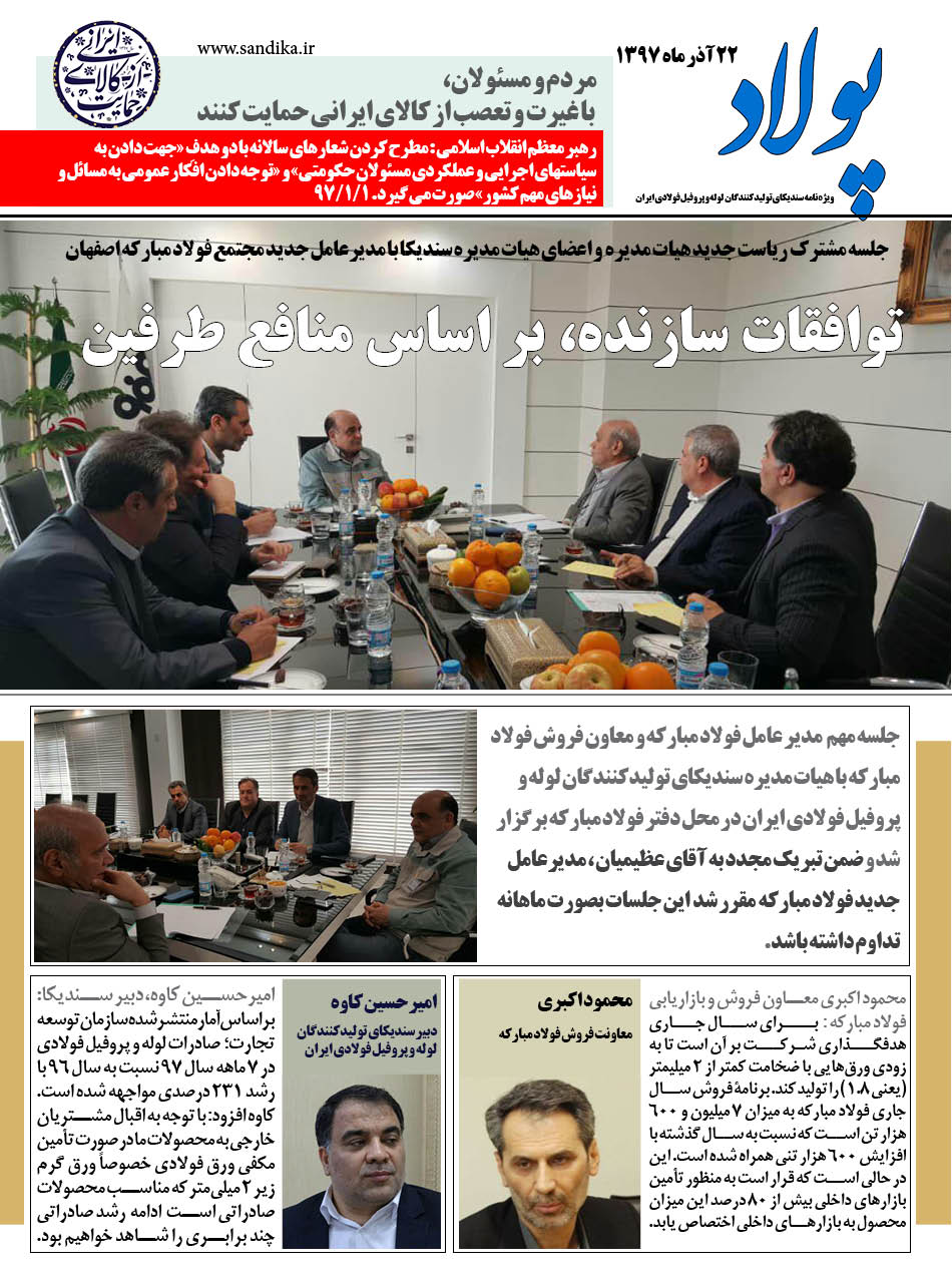 جلسه مهم   مدیر عامل فولاد مبارکه و معاون فروش فولاد مبارکه با هیات مدیره سندیکای تولیدکنندگان لوله و پروفیل فولادی ایران در محل دفتر فولاد مبارکه برگزار شد و ضمن تبریک مجدد به آقای عظیمیان ، مدیرعامل جدید فولاد مبارکه  مقرر شد  این جلسات بصورت ماهانه تداوم داشته باشد.