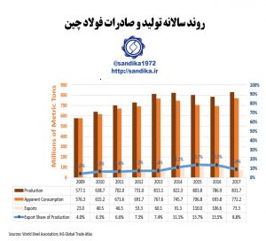 نمودار ۱۲۳✅روند سالانه تولید و صادرات فولاد چین