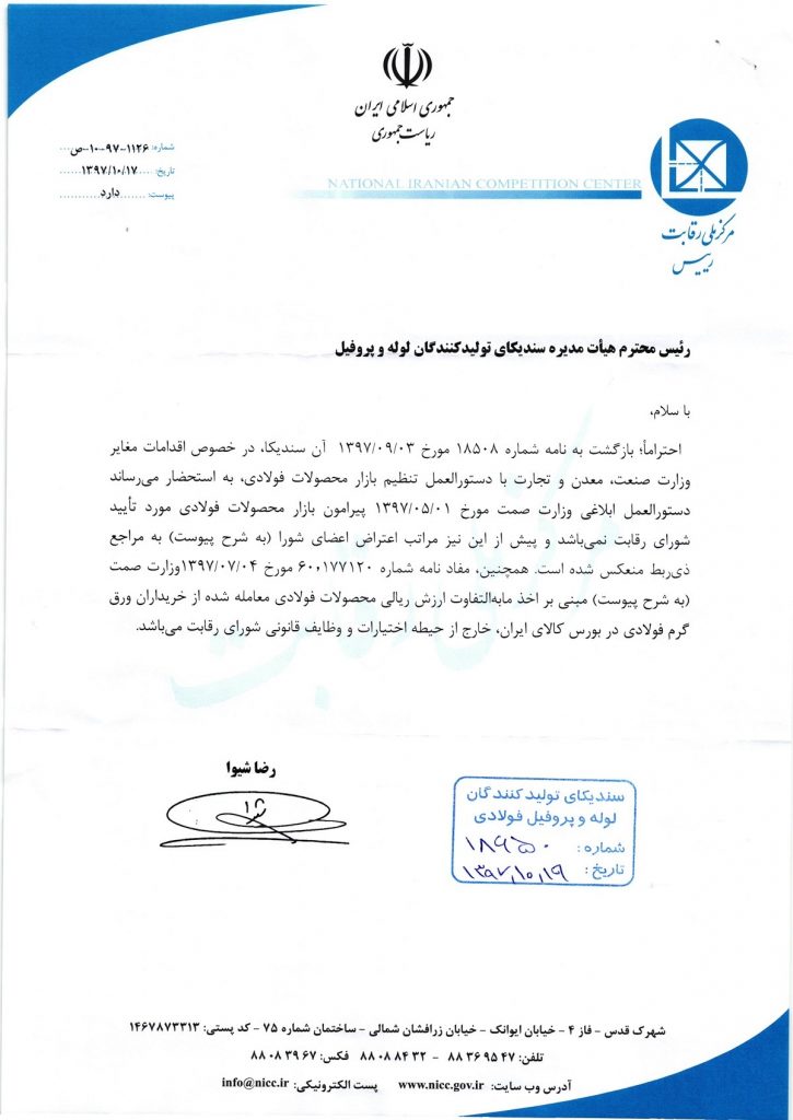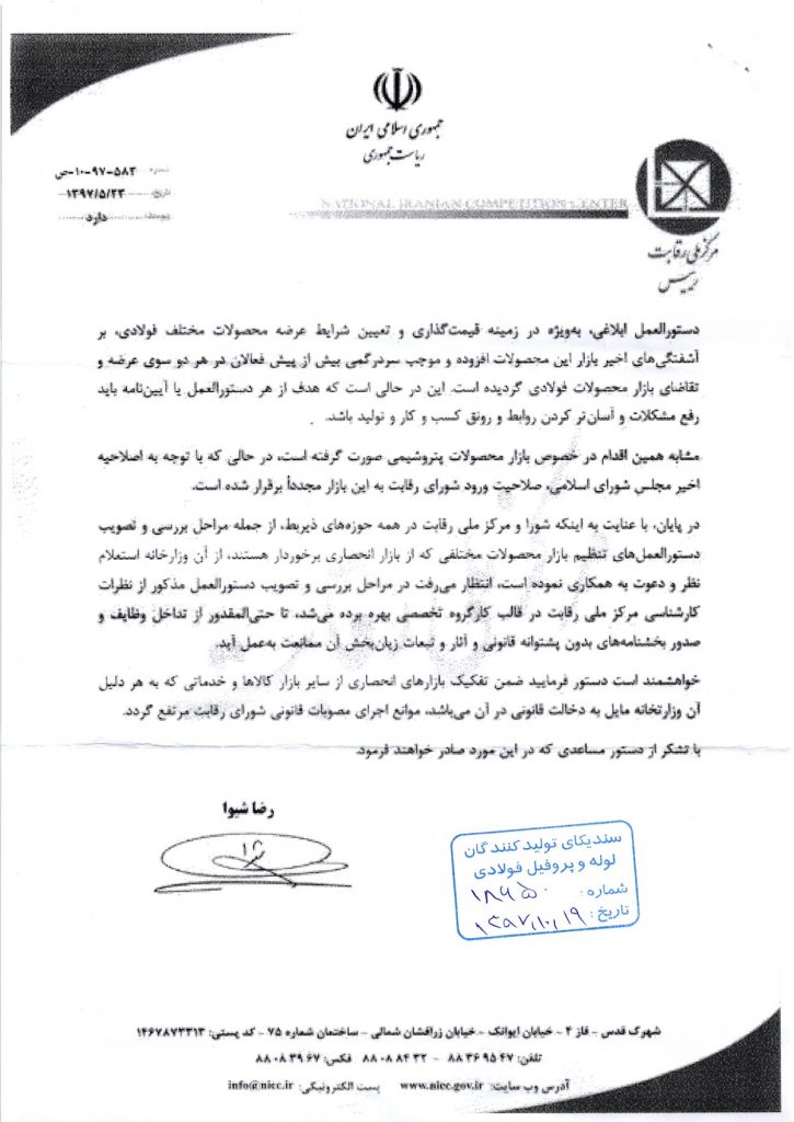 احتراما؛ بازگشت به نامه شماره ۱۸۵۰۸ مورخ ۱۳۹۷ / ۰۹ / ۰۳ آن سندیکا، در خصوص اقدامات مغایر وزارت صنعت، معدن و تجارت با دستورالعمل تنظیم بازار محصولات فولادی، به استحضار می رساند دستورالعمل ابلاغی وزارت صمت مورخ ۱۳۹۷ / ۰۵ / ۰۱ پیرامون بازار محصولات فولادی مورد تأیید شورای رقابت نمی باشد و پیش از این نیز مراتب اعتراض اعضای شورا (به شرح پیوست) به مراجع ذیربط منعکس شده است. همچنین، مفاد نامه شماره ۶۰٫۱۷۷۱۲۰ مورخ ۱۳۹۷ / ۰۷ / ۰۴ وزارت صمت به شرح پیوست) مبنی بر اخذ مابه التفاوت ارزش ریالی محصولات فولادی معامله شده از خریداران ورق گرم فولادی در بورس کالای ایران، خارج از حیطه اختیارات و وظایف قانونی شورای رقابت می باشد.