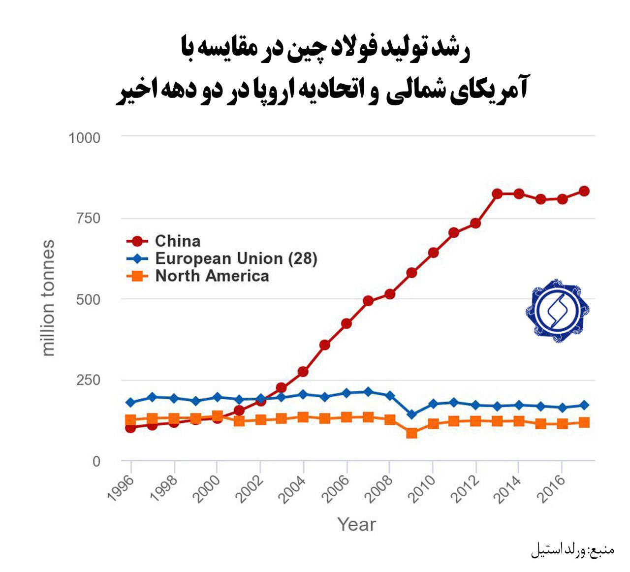 رشد تولید فولاد چین در مقایسه با آمریکای شمالی و اتحادیه اروپا در دو دهه اخیر