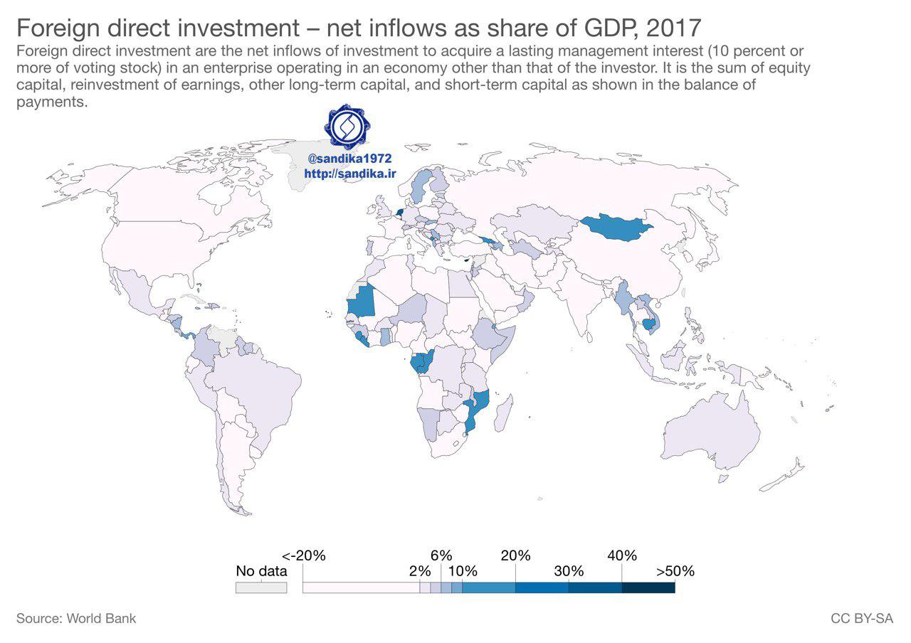 ۲۱۸. ♦️نقشه جهانی سرمایه گذاری مستقیم خارجی ورودی (درصد از تولید ناخالص داخلی) نسبت سرمایه گذاری مستقیم خارجی ورودی ایران به تولید ناخالص داخلی: ۱.۱۴ درصد @sandika1972