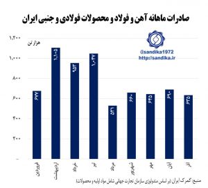 ۲۲۰ / روند حجم صادرات ماهانه آهن و فولاد و محصولات فولادی و جنبی ایران در نه ماهه اول سال ۱۳۹۷