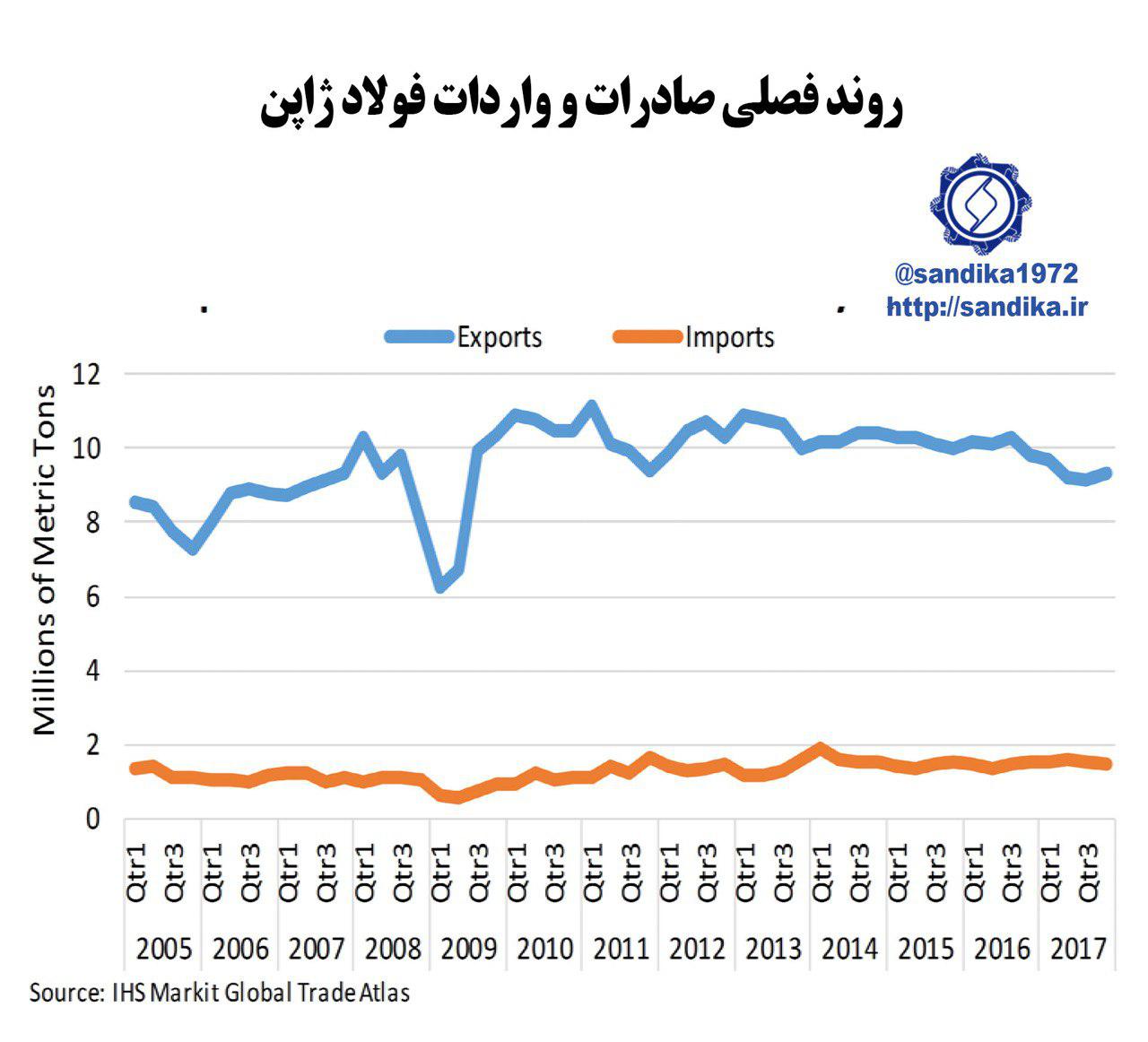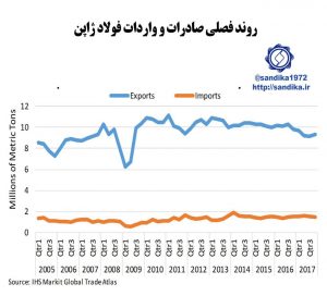نمودار ۱۳ اسفند ۱۳۹۷ شناسه خبر : 5771 ۲۹۱✅روند فصلی صادرات و واردات فولاد ژاپن ۲۹۱✅روند فصلی صادرات و واردات فولاد ژاپن ۲۹۱✅روند فصلی صادرات و واردات فولاد ژاپن