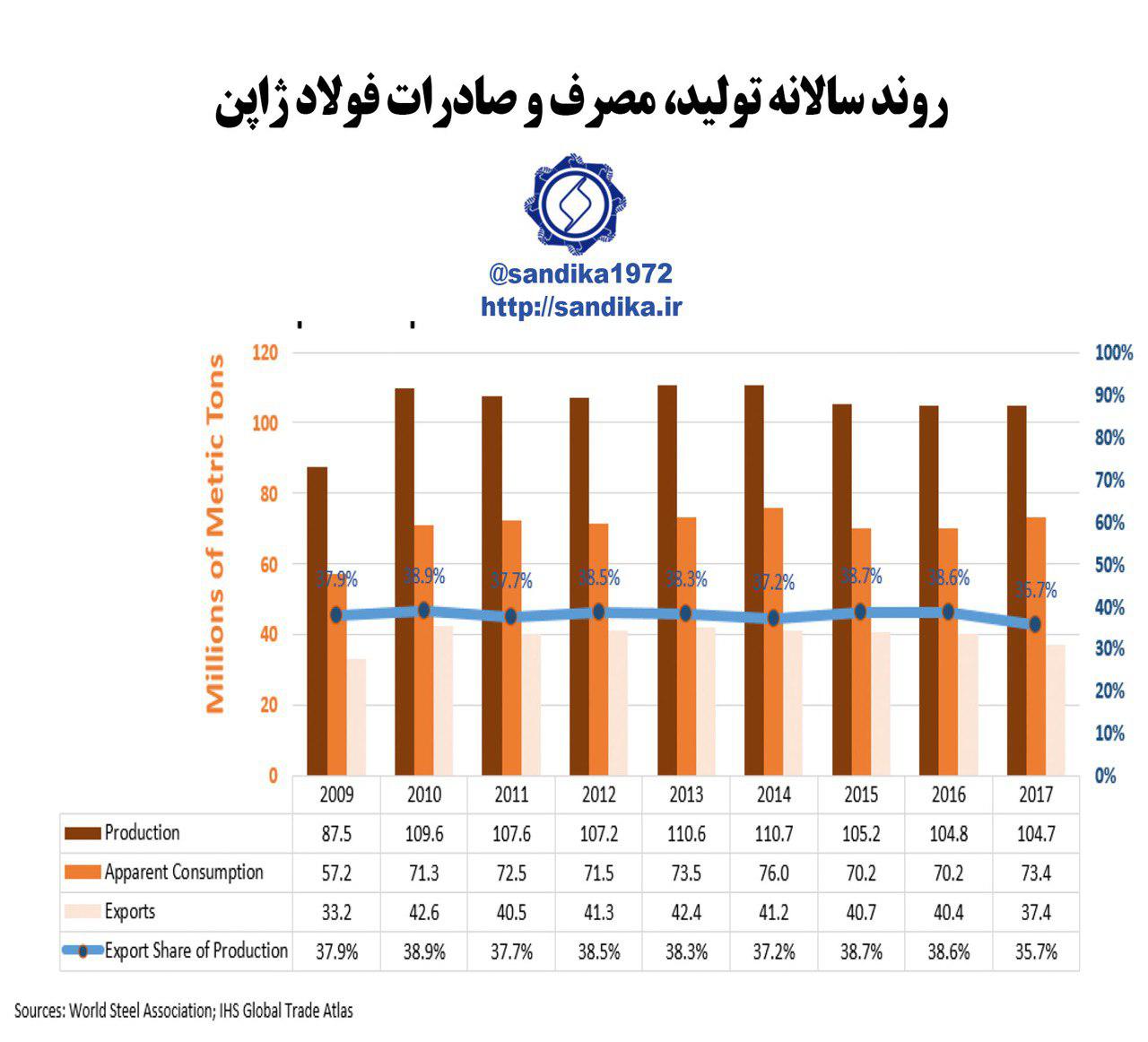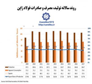 ۲۹۴ ✴️روند سالانه تولید، مصرف و صادرات فولاد ژاپن