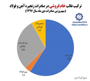 ۲۹۸ ◾️◾️ترکیب غالب خام فروشی در صادرات زنجیره آهن و فولاد (سهم وزنی صادرات دی ماه سال ۱۳۹۷)
