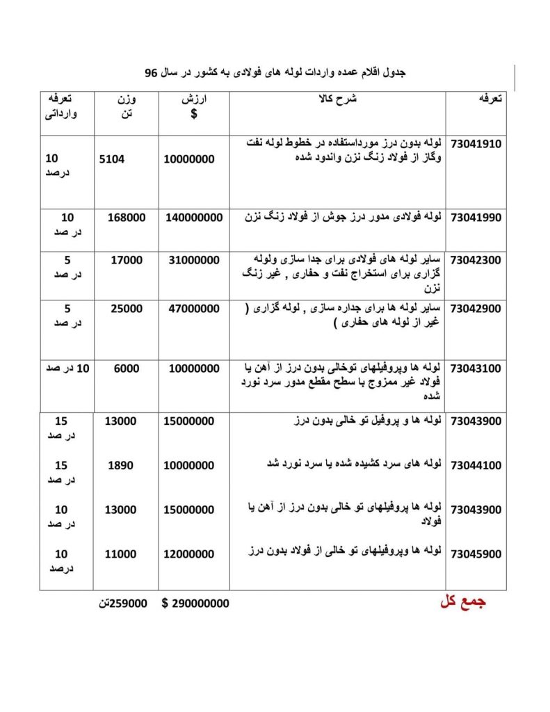 .از طرفی با بررسی صادرات تعرفه های مشابه در سال ۹۶ میتوان میزان توازن لوله های مختلف فولادی قطور از جمله در جوش و بدون درز را در کشور به دست آورد .