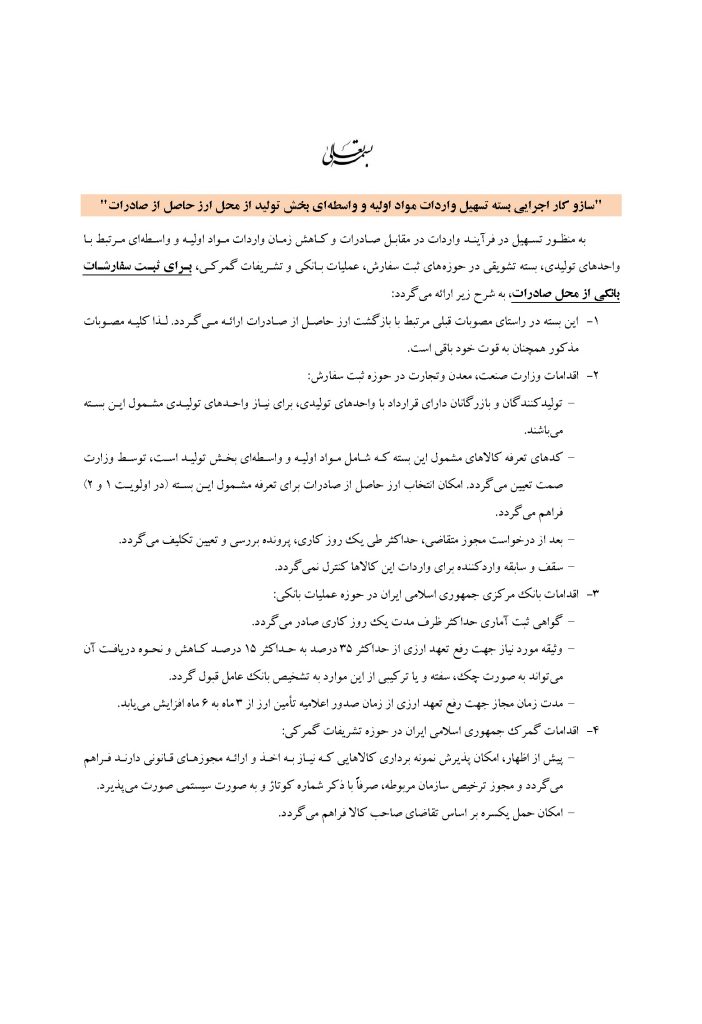 سازوکار اجرایی بسته تسهیل واردات مواد اولیه و واسطه ای بخش تولید از محل ارز حاصل از صادرات و حساب ارزی واردکننده جهت دانلود فایل پی دی اف کلیک نمایید Baste_Tashvighi