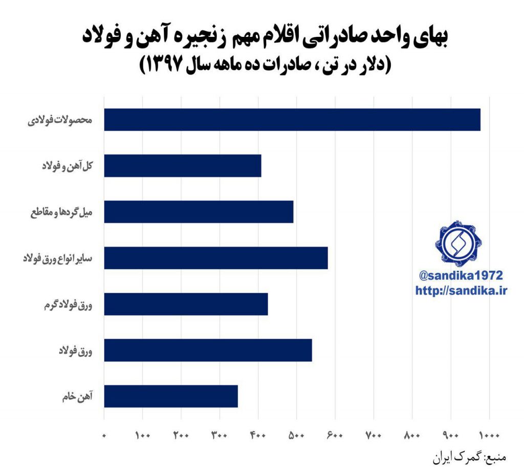 ۳۱۱. ✅بهای واحد صادراتی اقلام مهم زنجیره آهن و فولاد (دلار در تن ، صادرات ده ماهه سال ۱۳۹۷) sandika1972 شورای تحقیقات سندیکا #نمودار