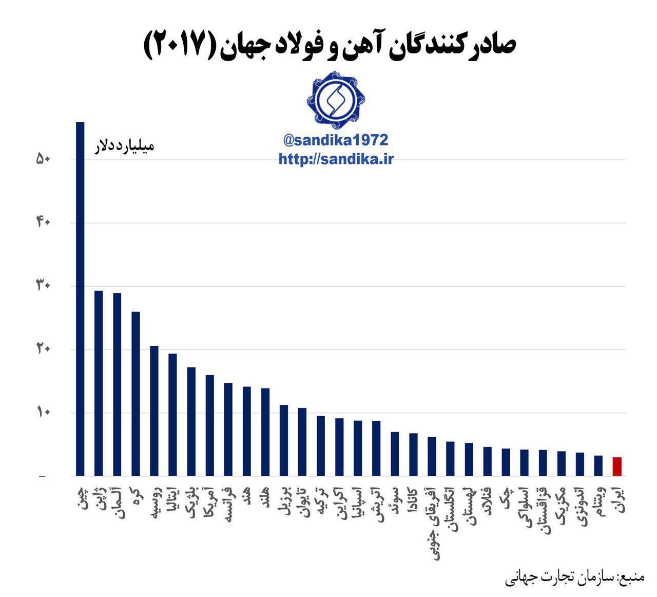 ۳۱۴ ♦️♦️مهم ♦️♦️ایران ۳۰ مین صادرکننده آهن و فولاد جهان با سهم ۰.۷ درصد از بازار جهانی در سال ۲۰۱۷ میلادی @sandika1972 🌸 #نمودار_فولادی شورای تحقیقات سندیکا