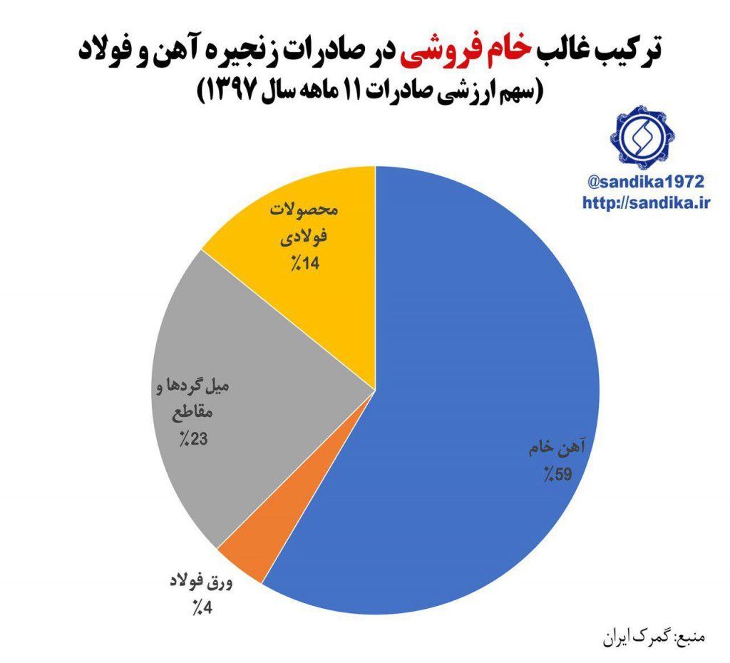 💢 در ۱۱ ماهه ۱۳۹۷، به میزان ۴.۳ میلیارد دلار آهن و فولاد و محصولات فولادی صادر شد که ۵۹ درصد آن شامل آهن خام بود.