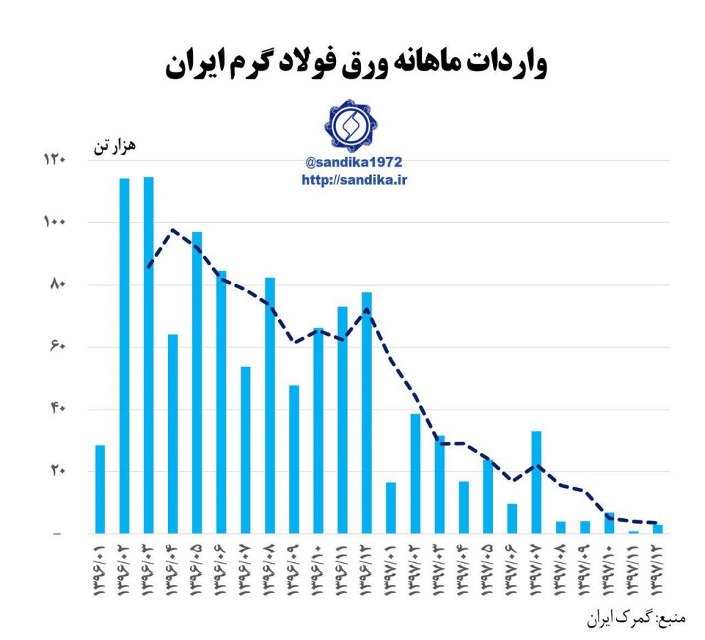 🔸 در فصل زمستان سال ۱۳۹۷، واردات ورق فولاد گرم به یک-بیستم مدت مشابه در سال قبل از آن سقوط پیدا کرد.