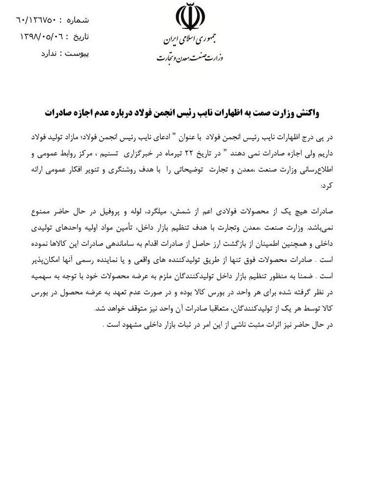 واکنش وزارت صمت به اظهارات نایب رئیس انجمن فولاد درباره عدم اجازه صادرات