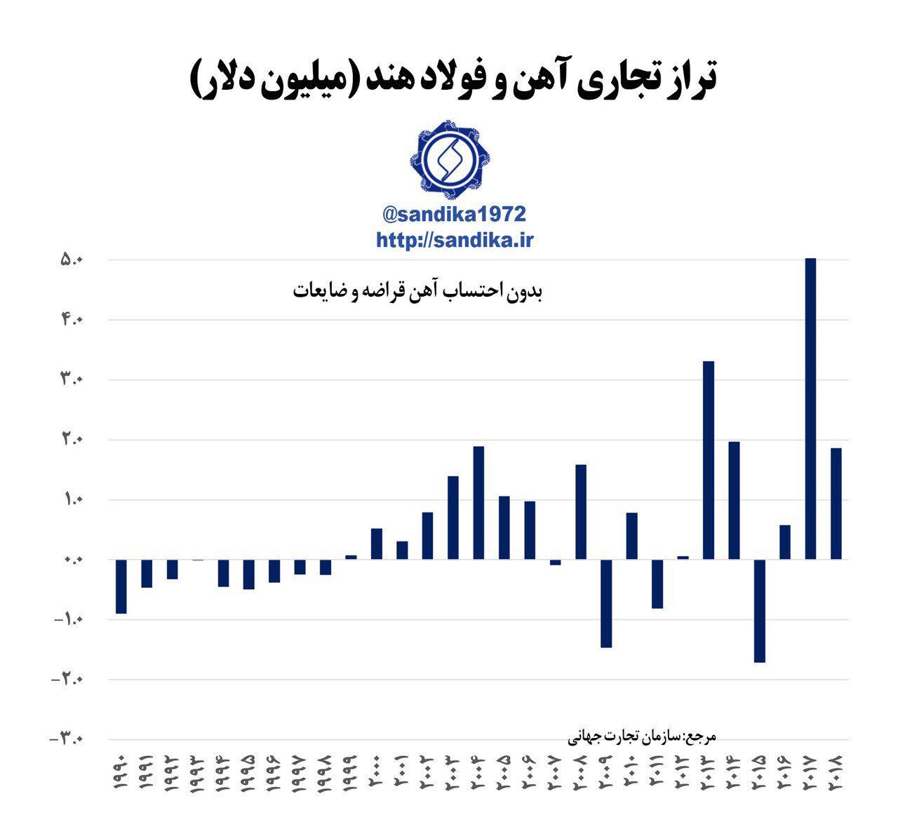 تراز تجاری آهن و فولاد هند (میلیارد دلار) با احتساب آهن قراضه تراز تجاری آهن و فولاد هند منفی ۱.۵ میلیارد دلار در سال ۲۰۱۸ میلادی است. @sandika1972 شورای تحقیقات سندیکا